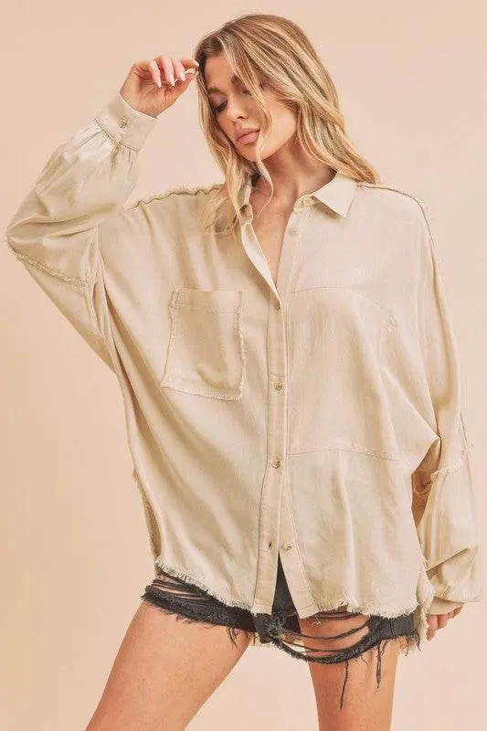 The Raw Edge Exposed Seam Collared Neck Long Sleeve Shirt combines a casual aesthetic with unique details. The raw edges and exposed seams add a touch of texture and modern flair to the classic collared shirt style. With its long sleeves and structured collar, this shirt is versatile and can be dressed up or down for different occasions. The raw edge and exposed seam details give this shirt a contemporary and edgy look.