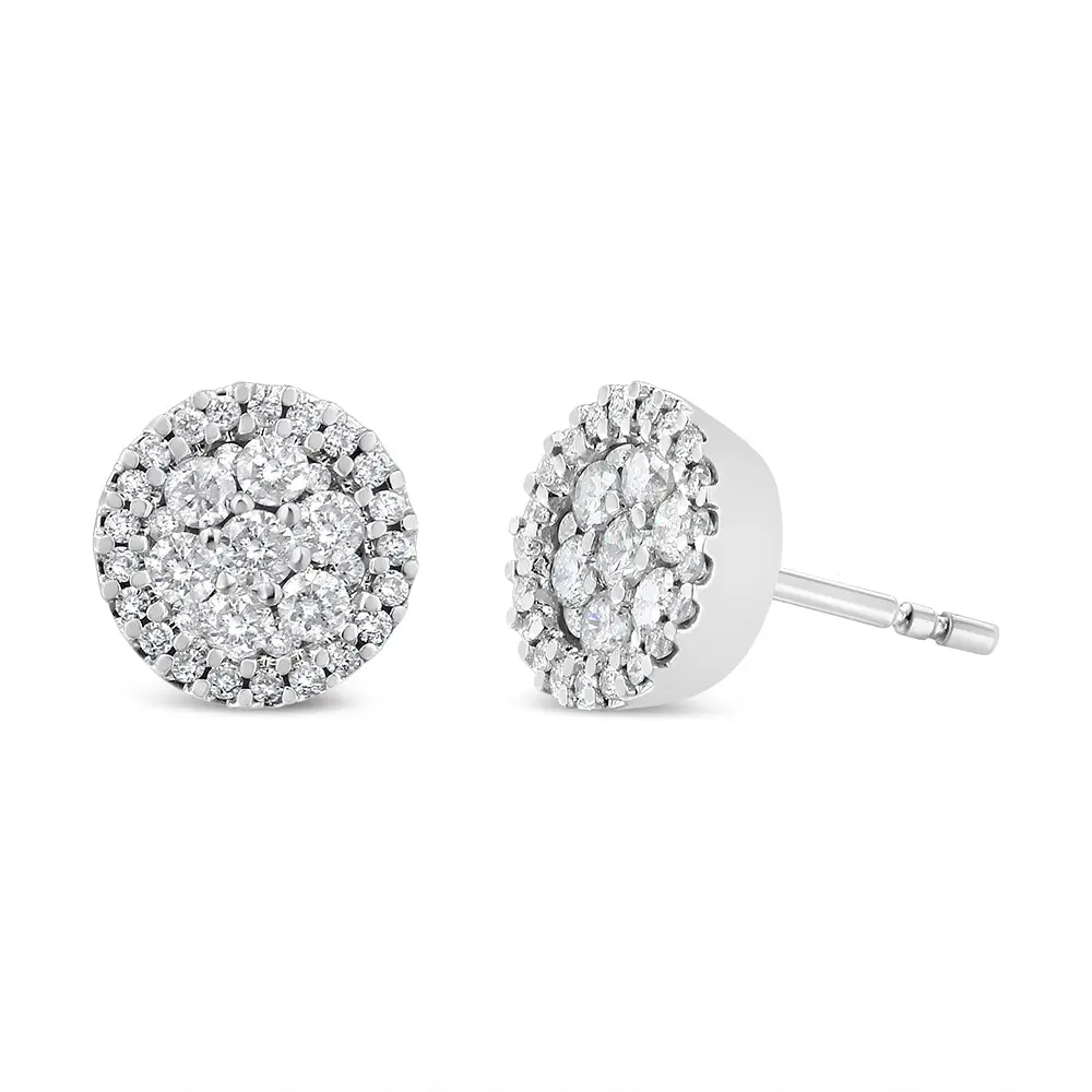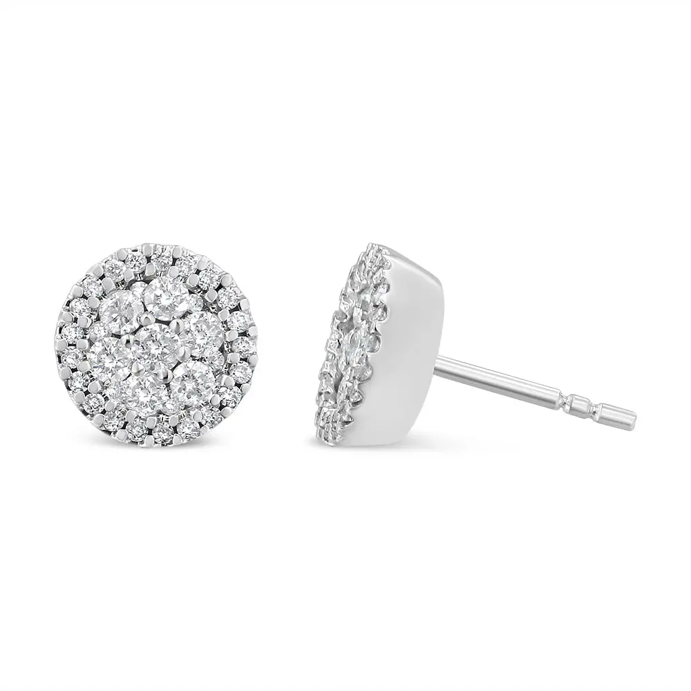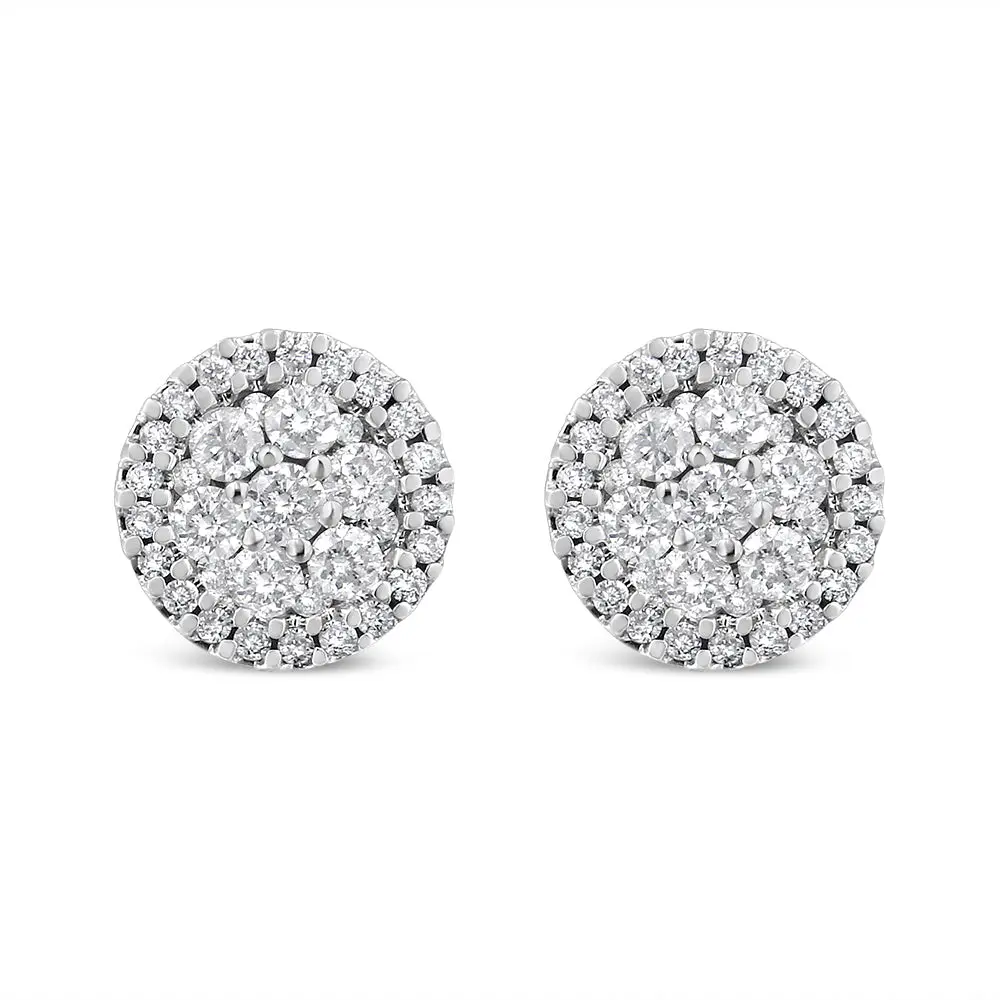 Elegant and timeless, these 14K white gold stud earrings feature round, brilliant cut diamonds in a halo style button shape. The earrings have three circular rows of diamonds of 1.0 carat total weight worth of diamonds. The earrings feature pushback closures with notched posts and friction backs that keep these pierced earrings safe and secure on your ears for comfortable, worry-free wear all day long. This authentic design is crafted of real 14 karat gold, a precious metal that will keep a tarnish-free shine for years to come. This conflict-free, AGS-certified diamond jewelry has been assessed and authenticated by the American Gemological Society’s expert gemologists. Diamonds are graded G-H in color and I1-I2 in clarity. These classic earrings make a great gift for any special occasion! Diamonds are thought to give the wearer clarity and illuminate solutions to lifes problems. These stud style floral cluster earrings are subtle enough for casual affairs but sparkle in formal settings as well. Coordinate these earrings with your favorite diamond necklace or other diamond jewelry to create a complete elegant ensemble.