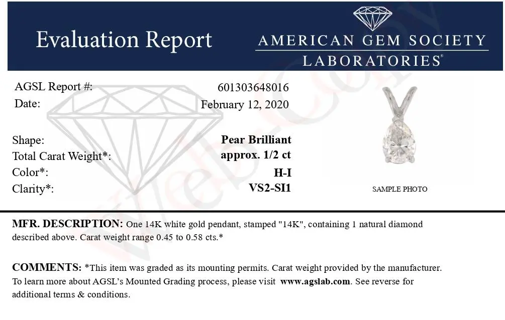 Be the first to review “AGS Certified 14K White Gold 1/2 Cttw Diamond Pear 18″ Pendant Necklace (H-I Color, VS2-SI1 Clarity)”
