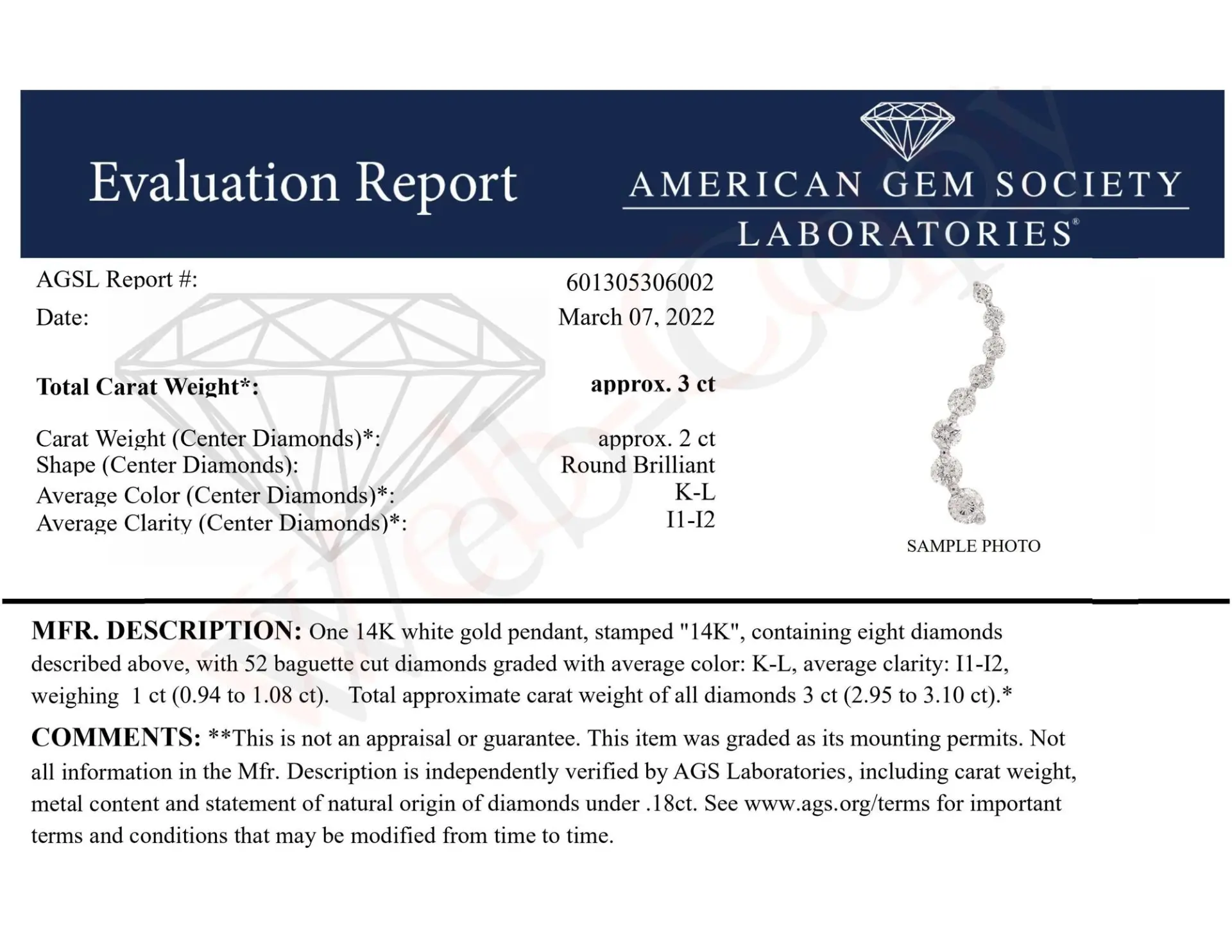 Surprise her by gifting her this beautiful 3.00 cttw diamond journey pendant on any special occasion. Featuring a classy design, the pendant is crafted of cool 14kt white gold. It is elegantly adorned with sparkling 8 graduating, prong-set round cut diamonds. The pendant is flanked with 54 sparkling baguette diamonds on the side for an extra sparkle. There is no better way to symbolize your growing love as you journey together. This piece comes with an AGS certificate for added peace of mind.