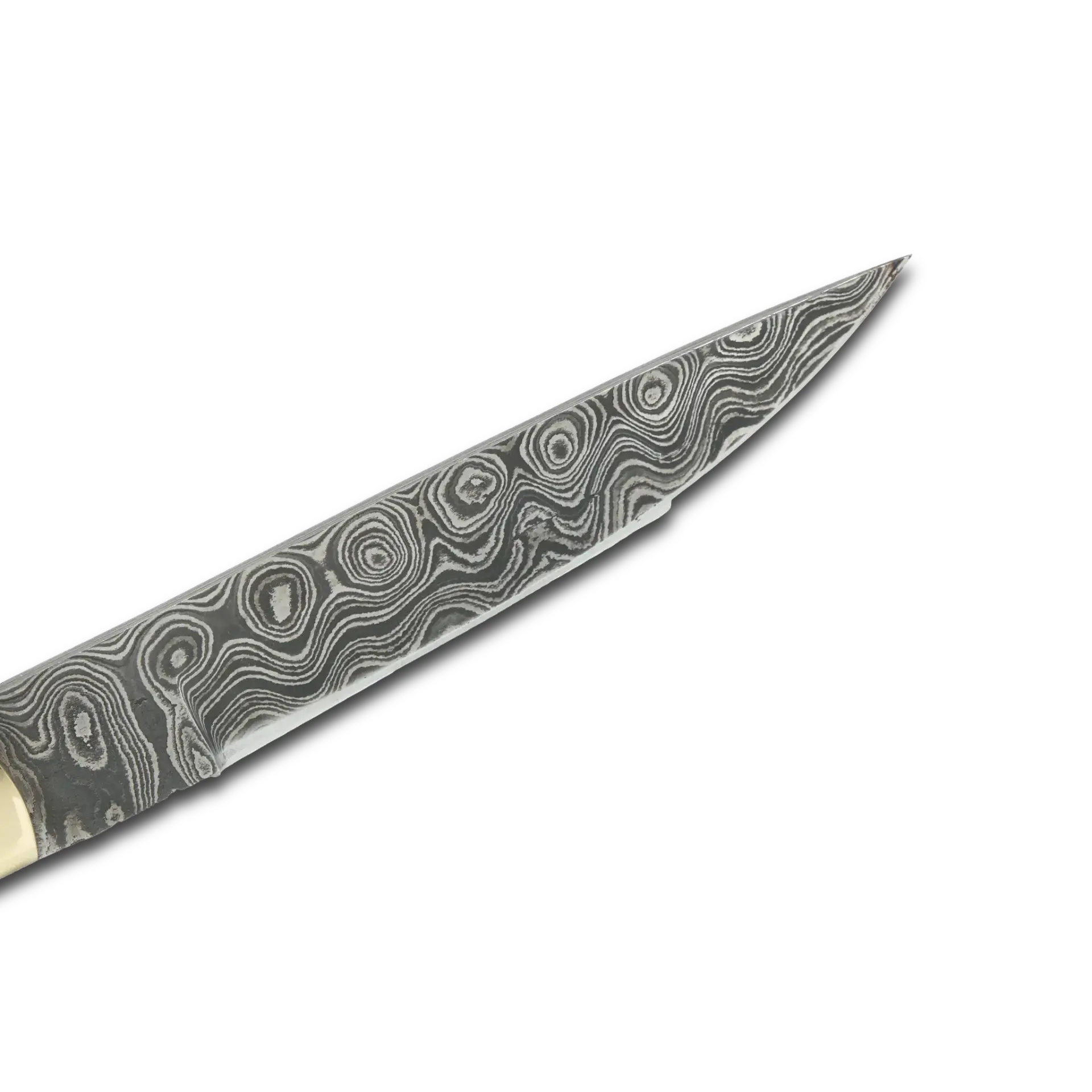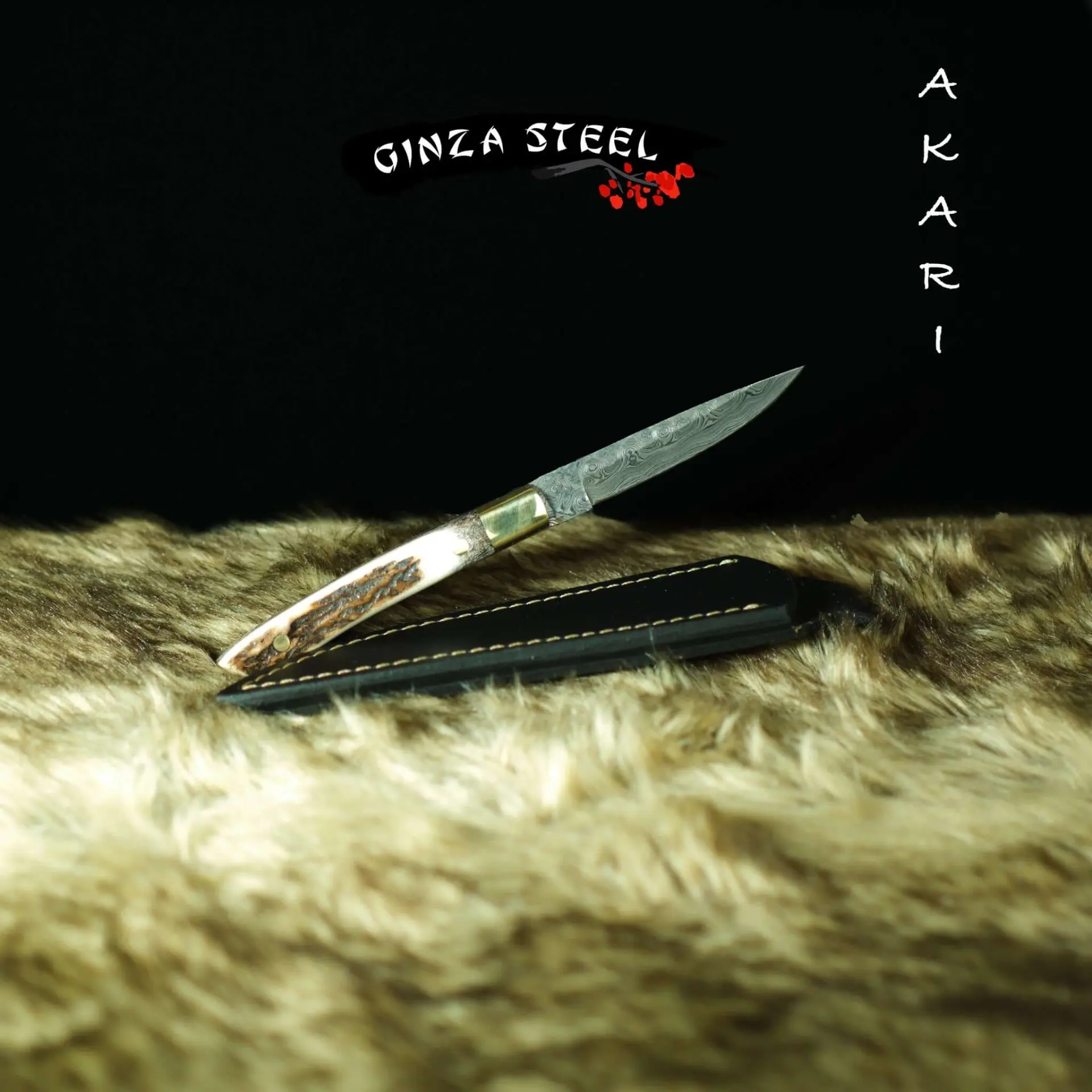 Ginza Steel’s Akari Skinner knife with an original stag horn handle. Each knife is handmade, which makes it unique. Bald is made with 256 layers of Damascus steel, resulting in beautiful and unique Damascus Patterns. The knife comes with a handstitched Original Leather Sheath