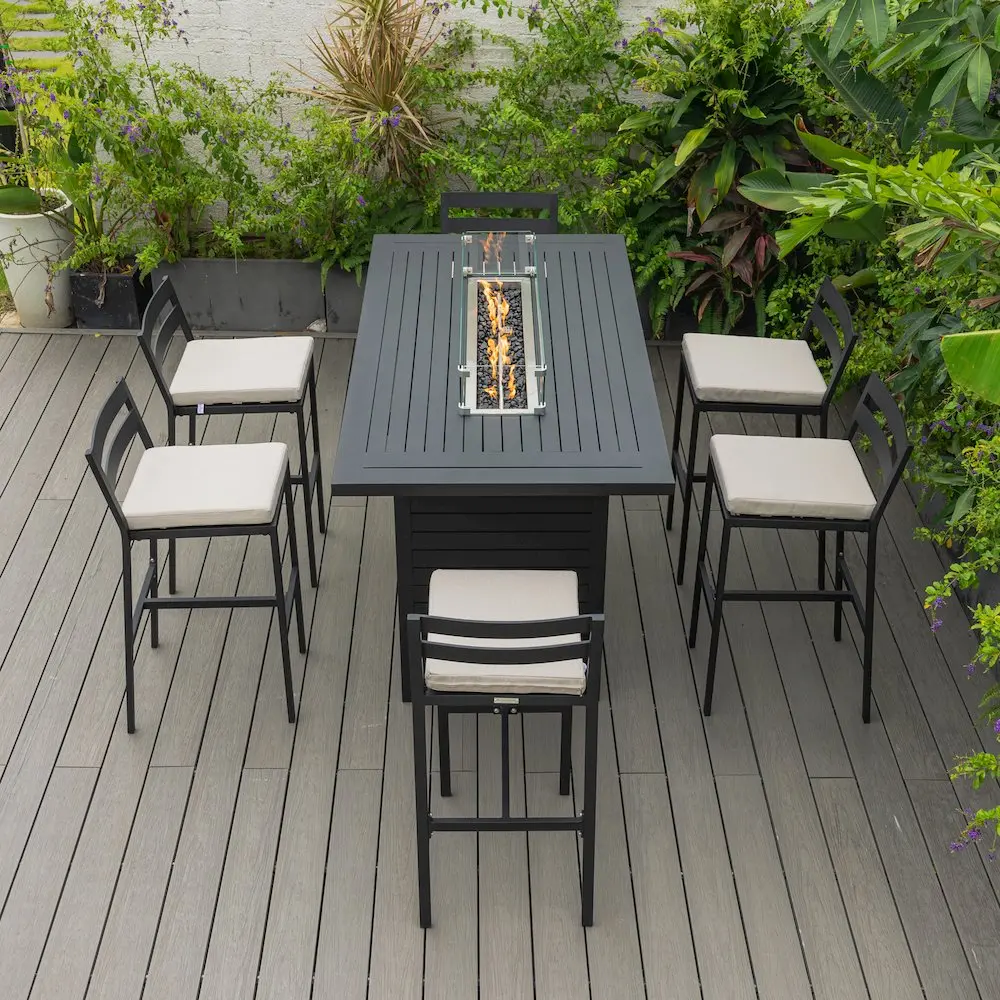 Turn up the heat and bring the fun outside with the LeisureMod Chelsea 7-Piece Patio Dining Bar Set! This stylish set includes a versatile fire pit bar table and six contemporary open-back bar chairs, perfect for breezy, social gatherings. Crafted from durable, powder-coated aluminum, the rust-resistant frames withstand outdoor elements with ease, while the tables 50,000 BTU fire pit feature keeps everyone warm as the sun goes down. The multi-functional table can shift from fire pit to dining surface with its secure lid, offering both warmth and a spacious place to gather. Each stool boasts plush, 2-inch-thick cushions covered in olefin fabric, known for its fade and moisture resistance. The removable, zippered cushion covers are machine washable for easy care. A glass guard around the flame shields from wind, providing a steady glow, while a hidden compartment discreetly stores the gas tank, keeping everything sleek. With electronic ignition and adjustable flame control, this set brings easy, adjustable warmth to any outdoor experience.