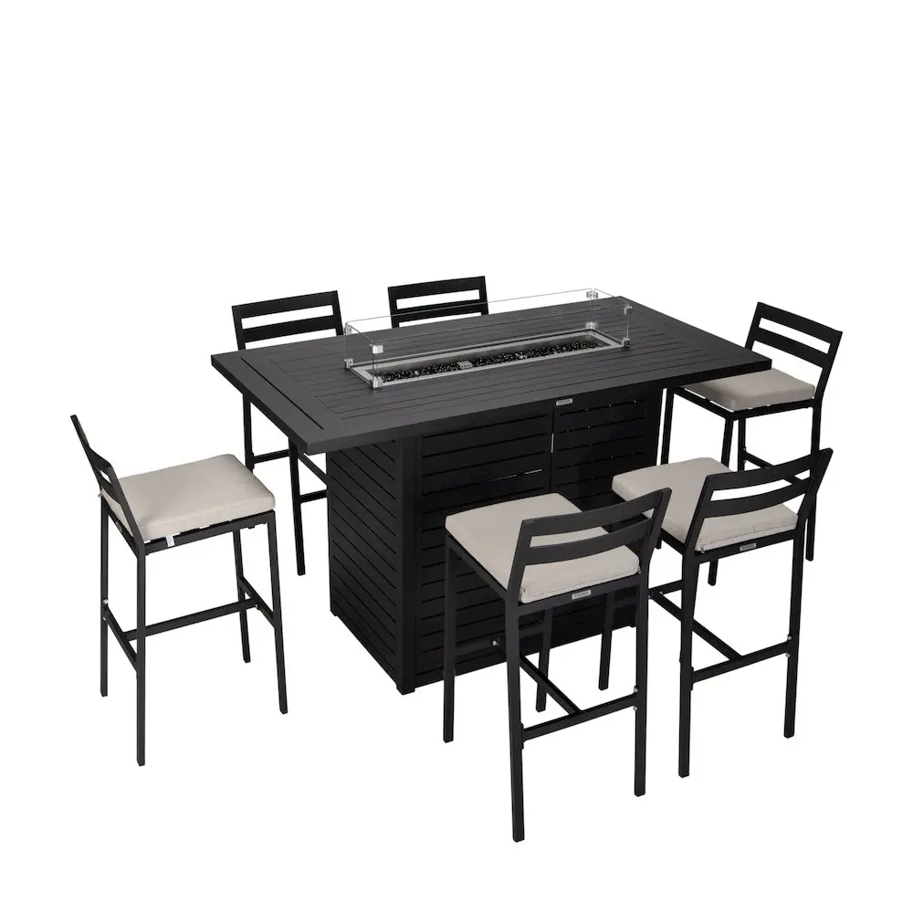 This set includes one fire pit bar table and six bar chairs, each featuring a low open-back design in a sleek black matte finish that enhances airflow for a cool seating experience The chairs and table are built with durable aluminum frames, known for resisting corrosion and maintaining strength in outdoor environments The patio stool’s 2-inch-thick cushion is upholstered in fade, moisture, and UV-resistant olefin fabric, suitable for outdoor use The fire pit table generates 50,000 BTUs, providing ample warmth for outdoor settings The fire pit table includes a glass guard to shield the flame from wind and maintain a steady fire. The glass guard adds a layer of safety by creating a protective barrier around the flame. The table has a dedicated compartment beneath the surface designed specifically to house the gas tank The fire pit is equipped with a reliable electronic ignition system that ignites the flame quickly and efficiently