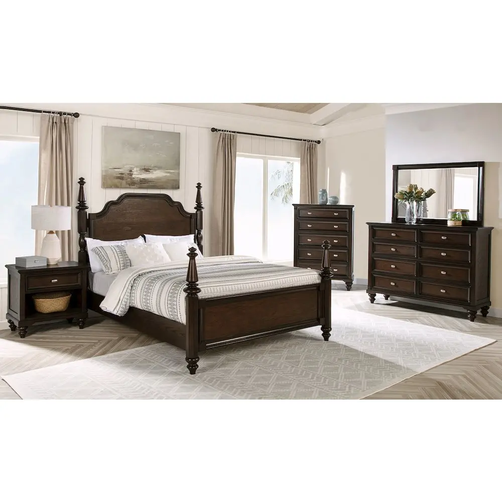 Four-poster queen bedroom set with traditional, elegant design Smooth-glide drawers with felt lining in the top drawers Gunmetal hardware adds a modern contrast Solid pine and oak veneer construction for durability and longevity