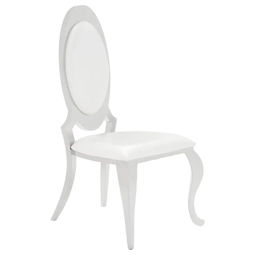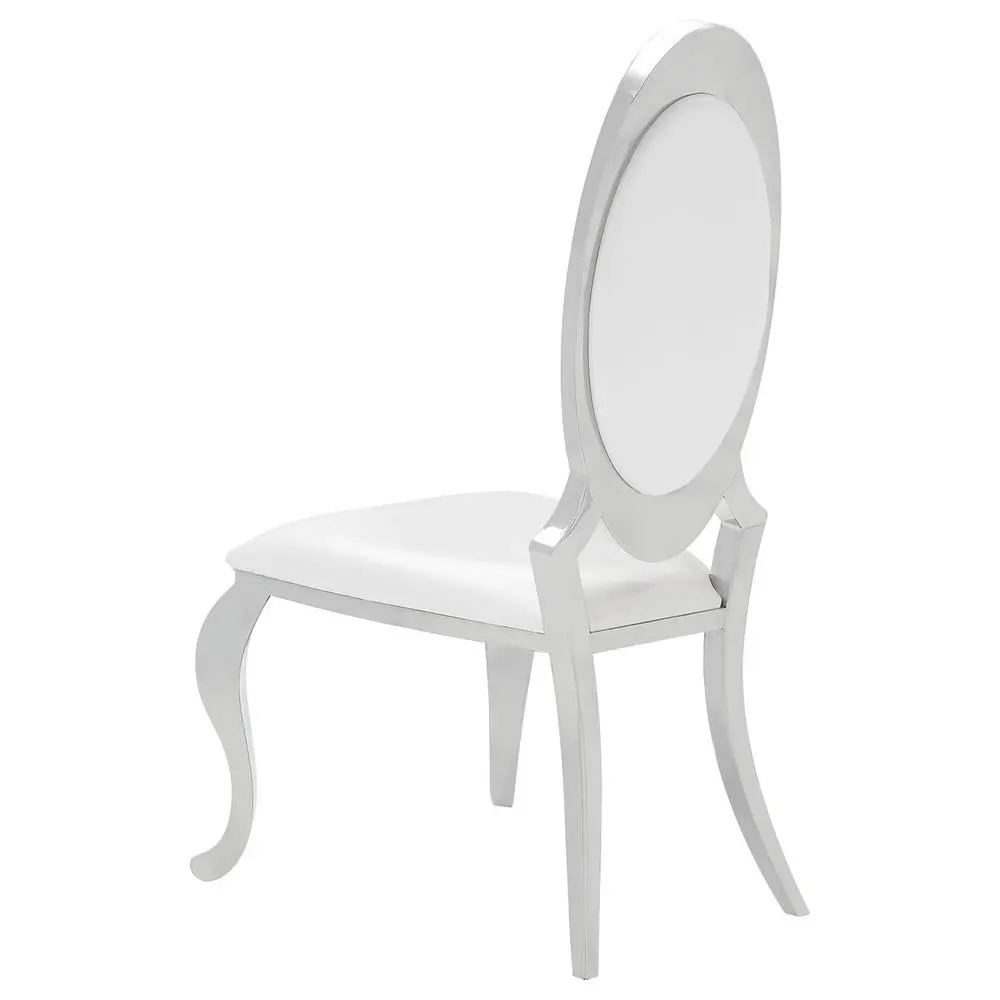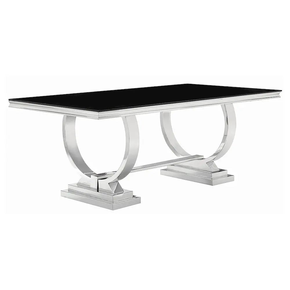 Transform your dining area with our captivating 7-piece dining set, seamlessly blending modern elegance and transitional charm. The meticulously designed dining table features a black tempered glass top embraced by a polished stainless steel frame. Circular base legs perch on silver tiered bases, crafting an enchanting silhouette. Coupled with regal dining chairs, the radiant table becomes the centerpiece, emanating enduring style. Chairs boast curves, oval seat backs, and creamy white upholstery, juxtaposed against polished stainless steel frames for striking contrast. Elevate your space into an eloquent blend of timeless sophistication and contemporary allure.