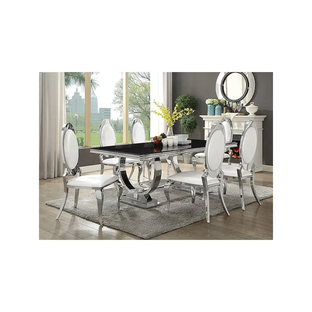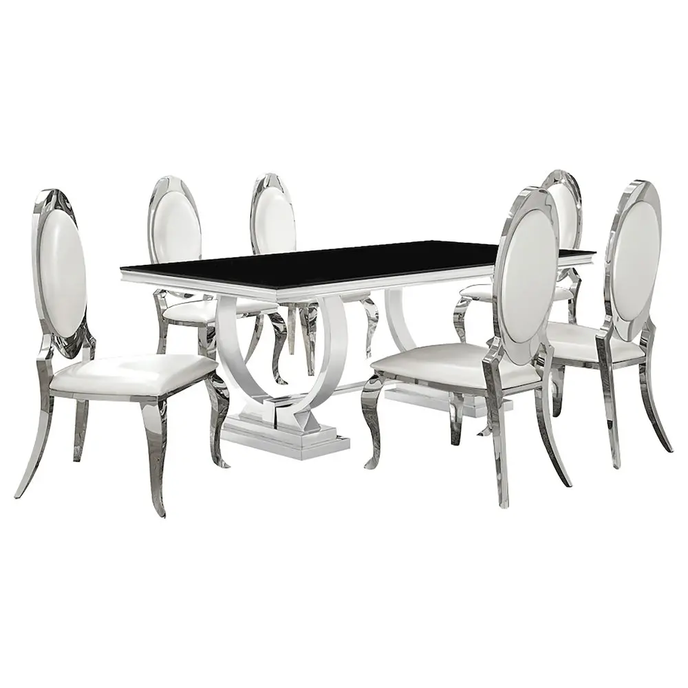 Discover the allure of our 7-piece dining set, a captivating fusion of modern elegance and transitional charm At the heart of this set lies a meticulously designed dining table, showcasing a luxurious black tempered glass top embraced gracefully by a meticulously polished stainless steel frame The circular base legs delicately perch upon silver tiered bases, meticulously crafting an enchanting and truly unforgettable silhouette The dining chairs, exuding a regal yet refreshingly modern vibe, boast elegant curves, oval seat backs, and are luxuriously cocooned in creamy white upholstery, creating a stunning contrast against the backdrop of polished stainless steel frames Witness the transformation of your dining area into an eloquent blend of peerless sophistication and captivating contemporary allure