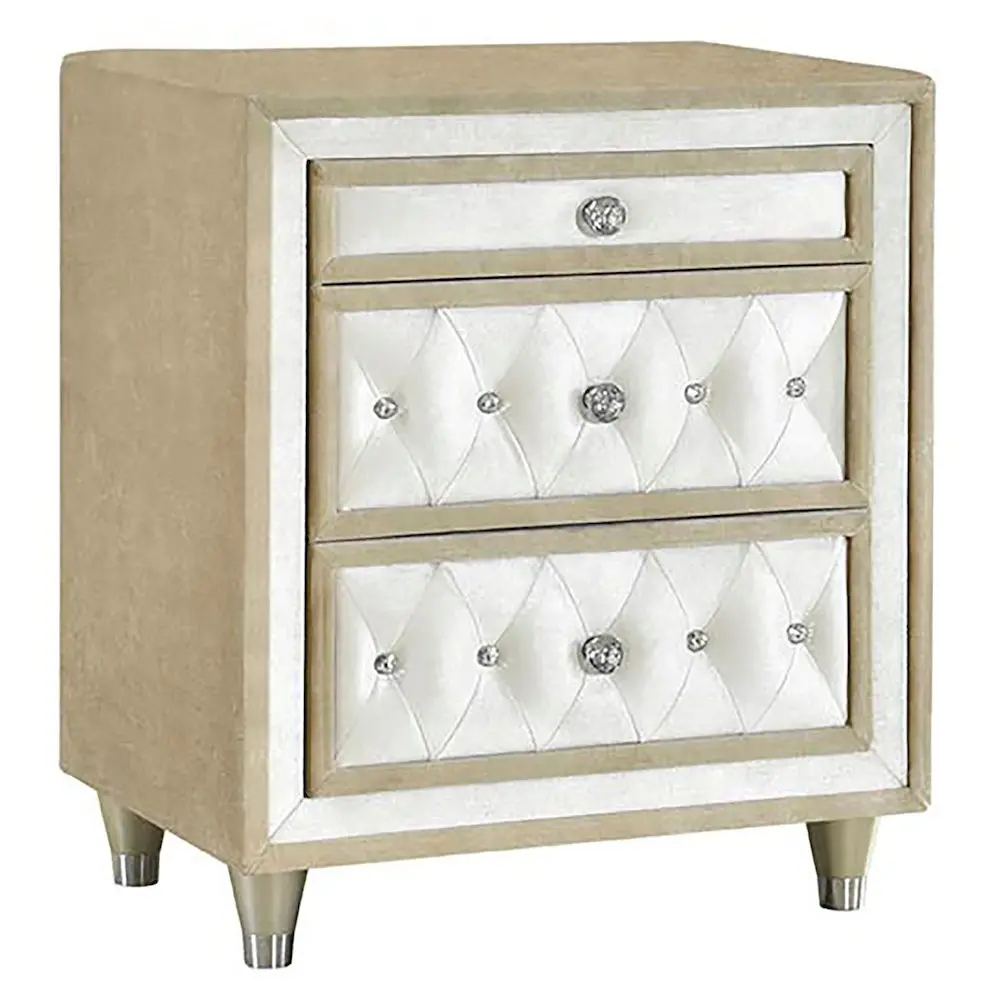 A traditional and modern bedroom set meets all expectations for an incredible impact in your sleeping space. Smooth and soft upholstered enhances each piece in this set. Coming in a camel and ivory color, this set is inspired by French Provincial decor. Crystal-like accents make their presence known within the button tufting. Gorgeous nailhead trim adds the finishing touch on this upholstered bedroom set.