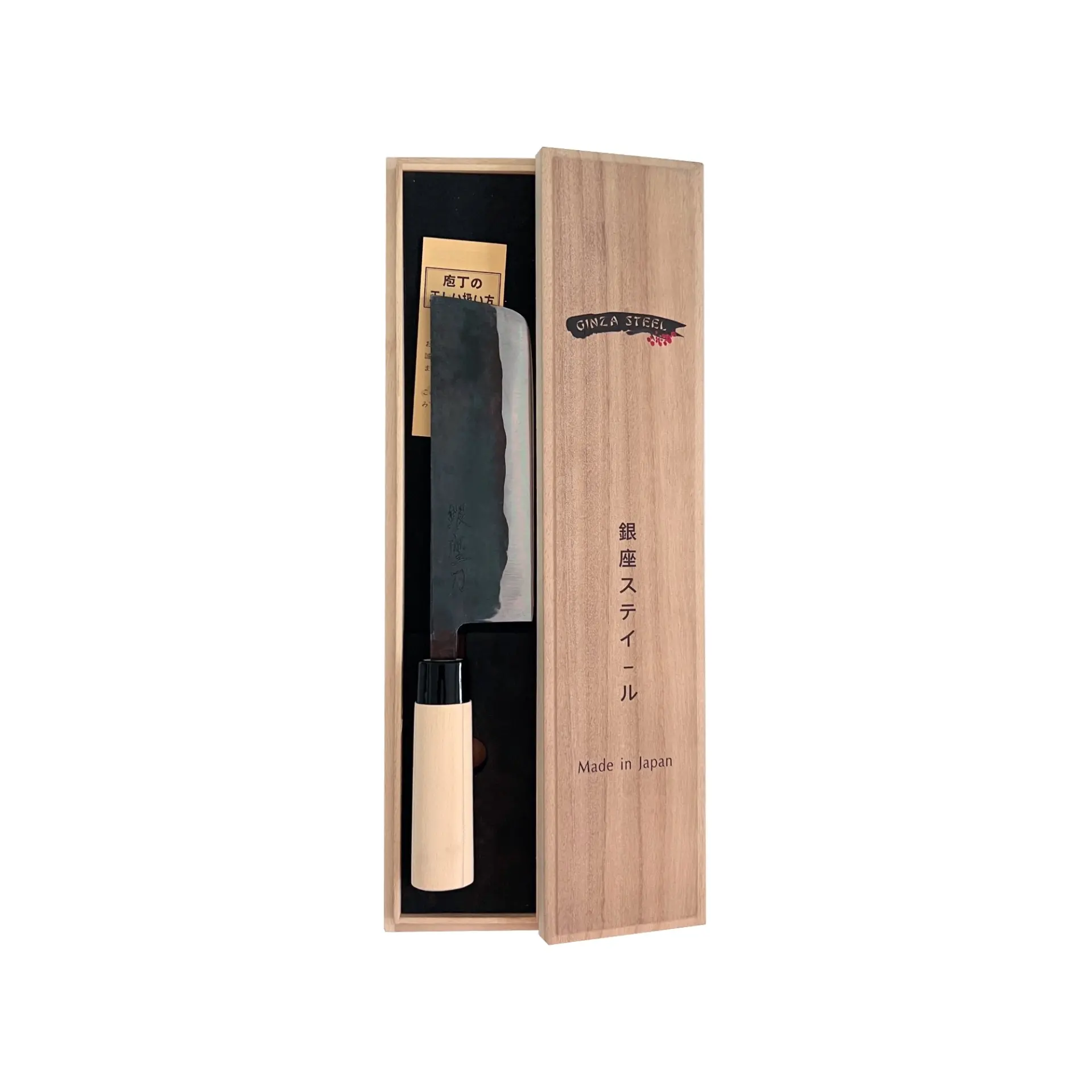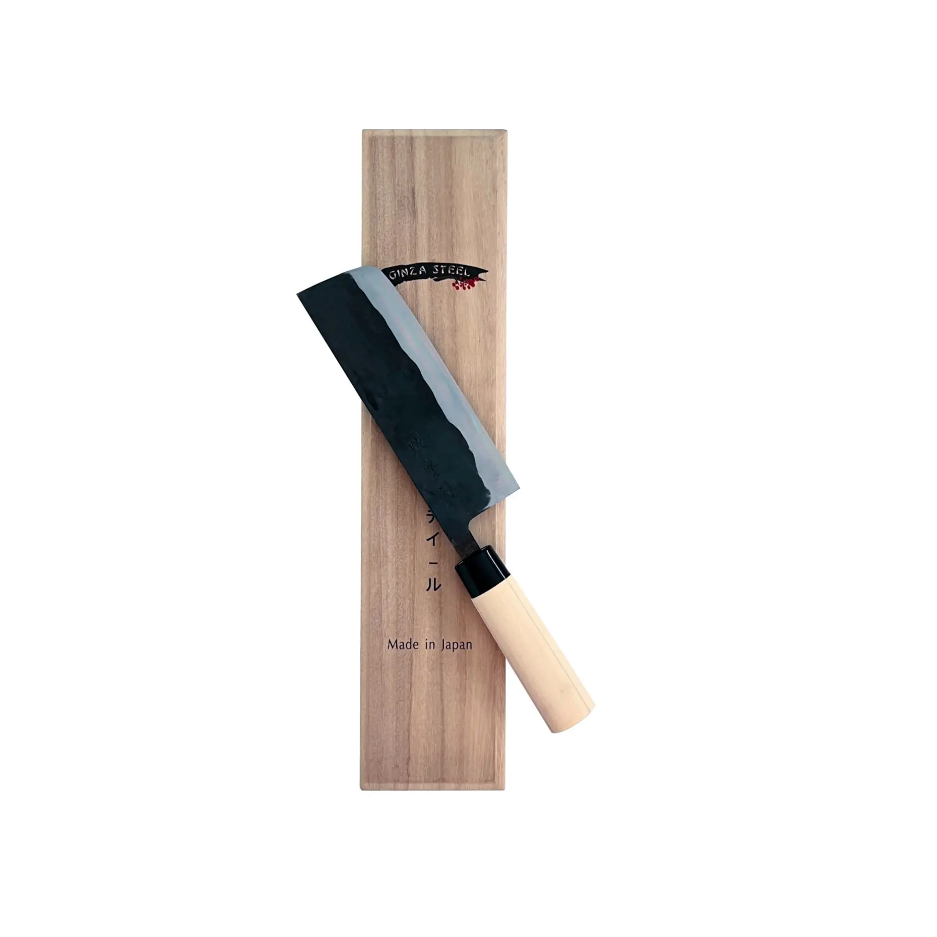Introducing the Handmade Ginza Steel Knife Set, comprising a 165mm Santoku knife and a 165mm Nakiri knife. Meticulously crafted by skilled artisans in Ginza, Japan, these knives feature Blue #2 Soft Iron Blades renowned for their exceptional sharpness and durability. The Santoku knife offers versatility in slicing, dicing, and chopping, while the Nakiri knife excels in vegetable preparation. Enhanced with ergonomic handles and traditional craftsmanship, this set epitomizes Japanese culinary tradition. Elevate your cooking journey with knives that seamlessly blend artistry and functionality.