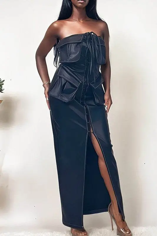 Introducing the “Athina button detailed PU black leather dress,” a sartorial masterpiece designed for the woman who owns the night. This dress exudes sophistication and allure, crafted from a luxurious, fluid PU leather that captures the essence of elegance. The sleek, off-shoulder bodice is accentuated by a delicate drawstring detail, creating a stunning silhouette that flatters with every move. Strategic paneling and bold pocket accents add a contemporary edge, while the high-slit skirt ensures a dramatic entrance and ease of movement. Perfect for upscale events or a glamorous night out, this gown is a celebration of modern femininity and confident style.