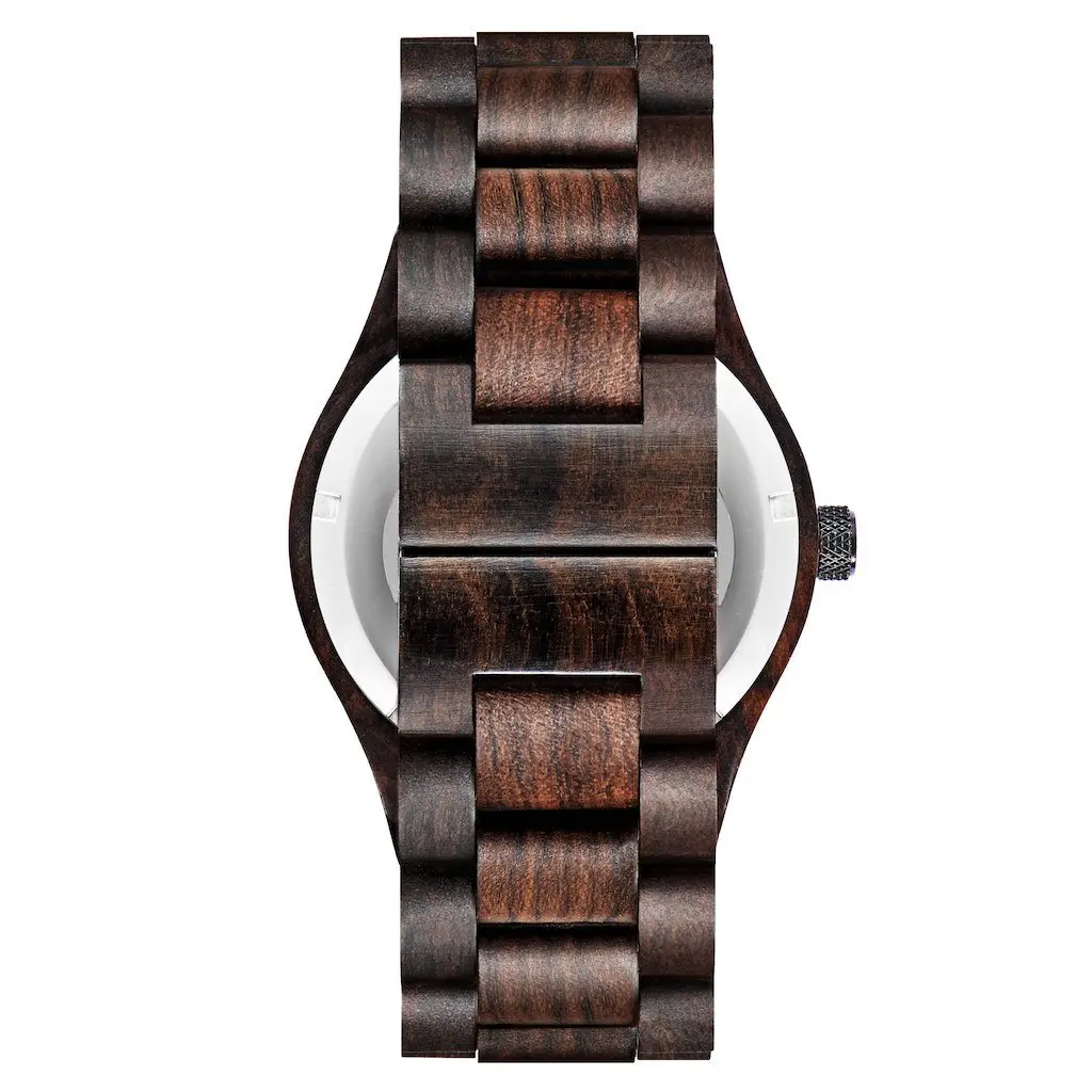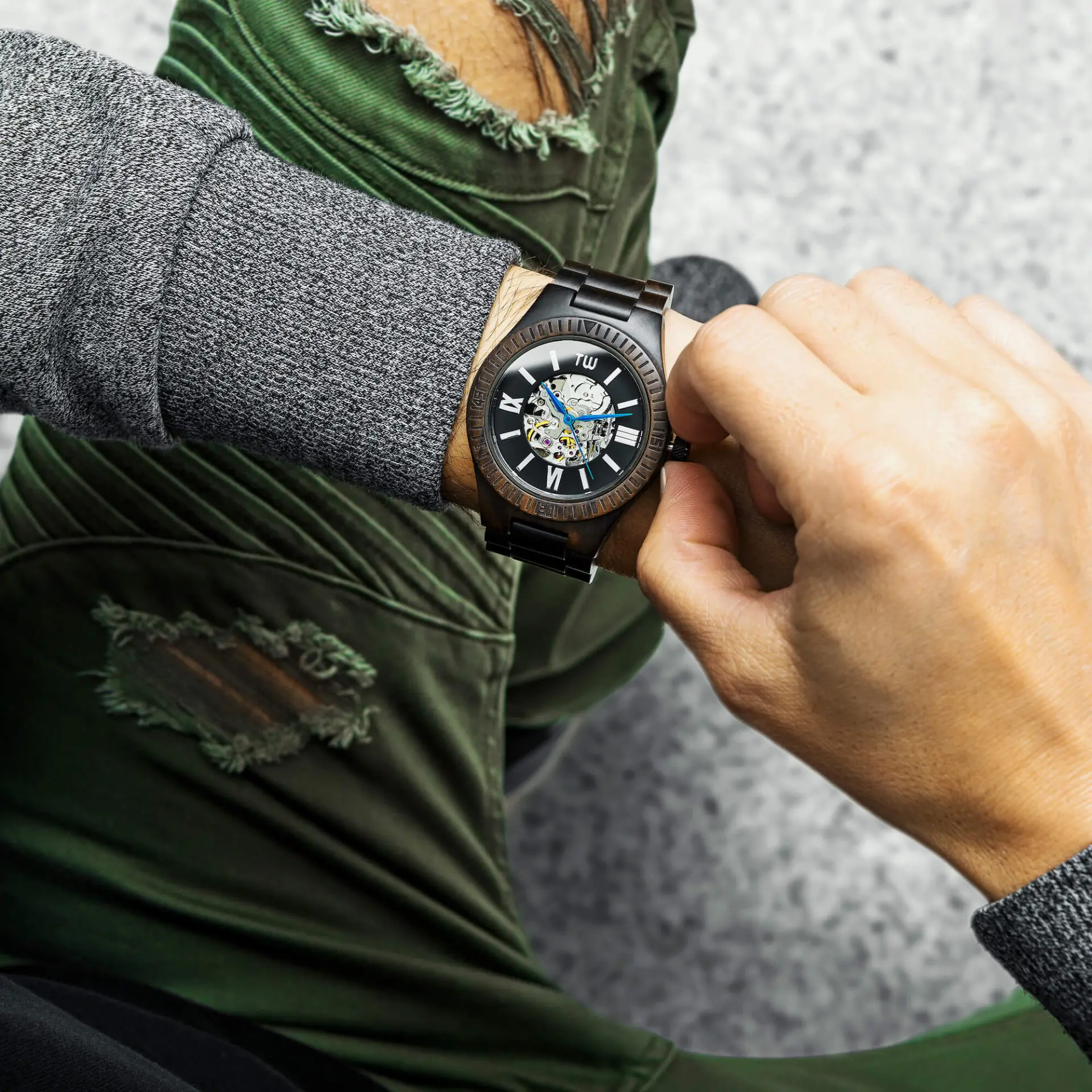 For the man who understands the importance of looking his best, this elegant timepiece is the top choice. Featuring an automatic self-winding movement housed in a sapphire coated mineral glass, the Atlas is a marvel in modern watch engineering. Stare into the sophisticated motion of exposed gears and rotors on the see-through skeleton dial as every second ticks by. Carefully handcrafted with black sandalwood, the polished dark wooden link band is held together by a classic butterfly clasp. This watch rests with an indescribable elegance on your wrist to give the top luxury watch brands a run for their money.