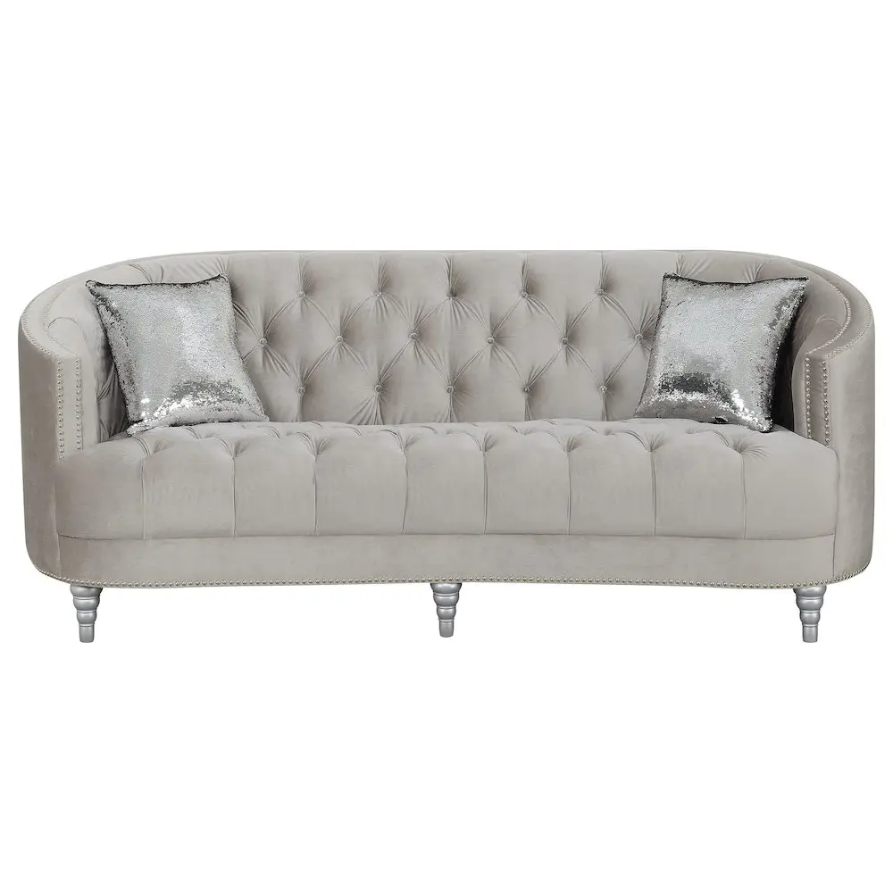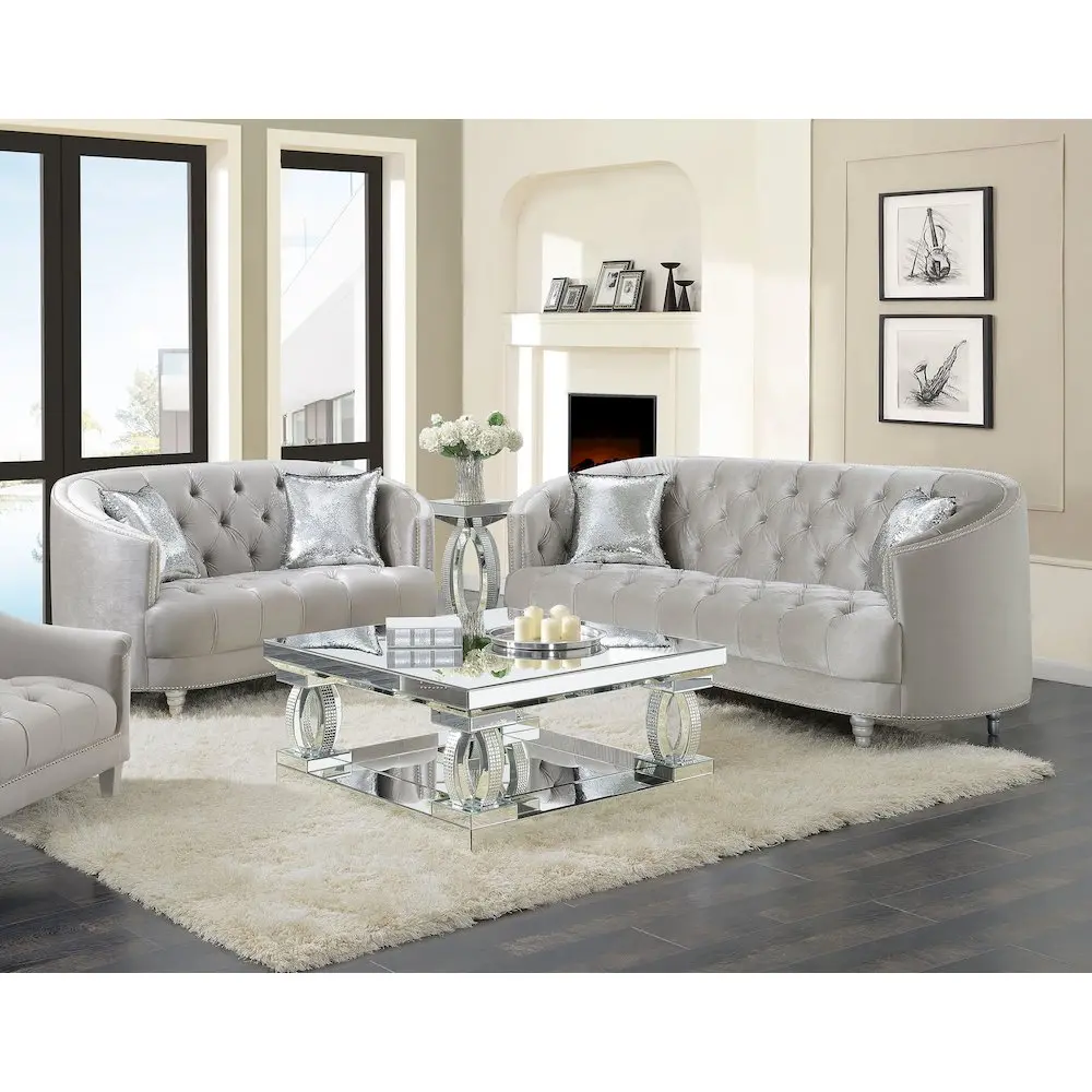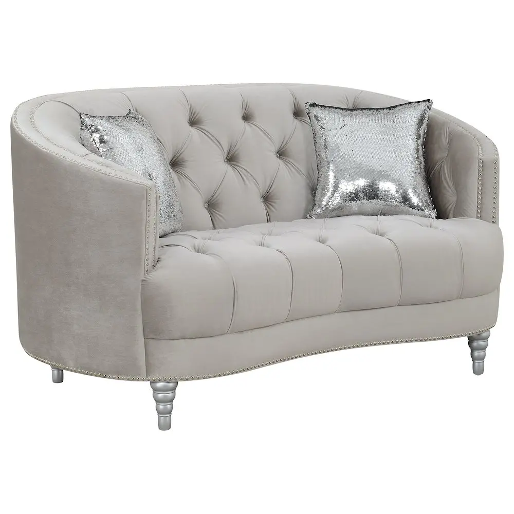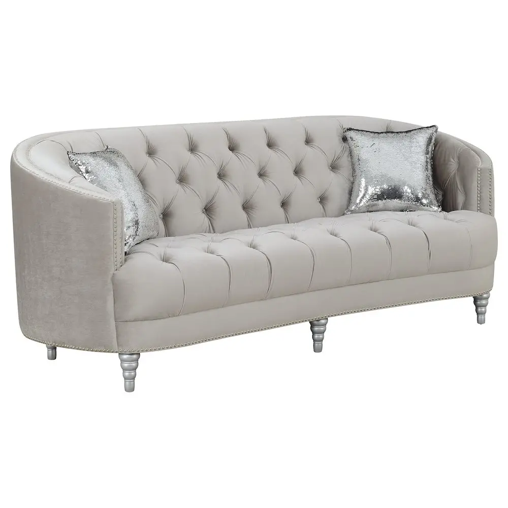 A modern spin on a classic traditional living room collection Graceful, C-shaped silhouette Soft, grey velvet upholstery with deep rhinestone tufting Elegant chrome nailhead trim Solid, turned wood legs in a silver finish This collection is also available in transitional linen-like cover