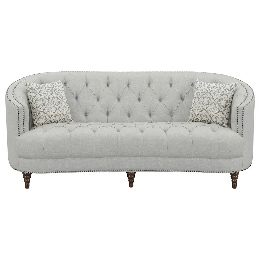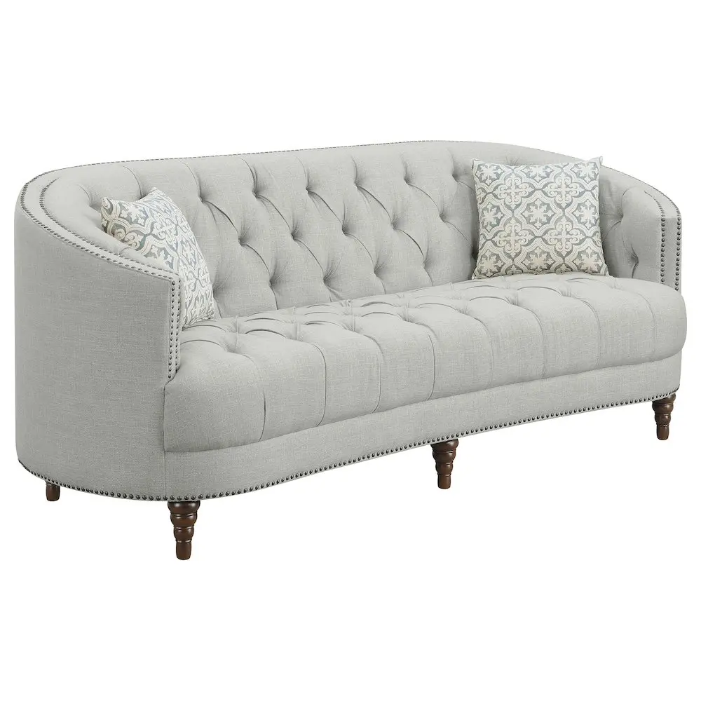 A modern spin on a classic traditional living room collection Soft, grey linen-like upholstery Button tufted seat and backrest Nailhead trim traces graceful, c-shaped frame on sofa and loveseat Beautiful detailed solid wood legs create the perfect foundation Available in off white velvet and grey velvet