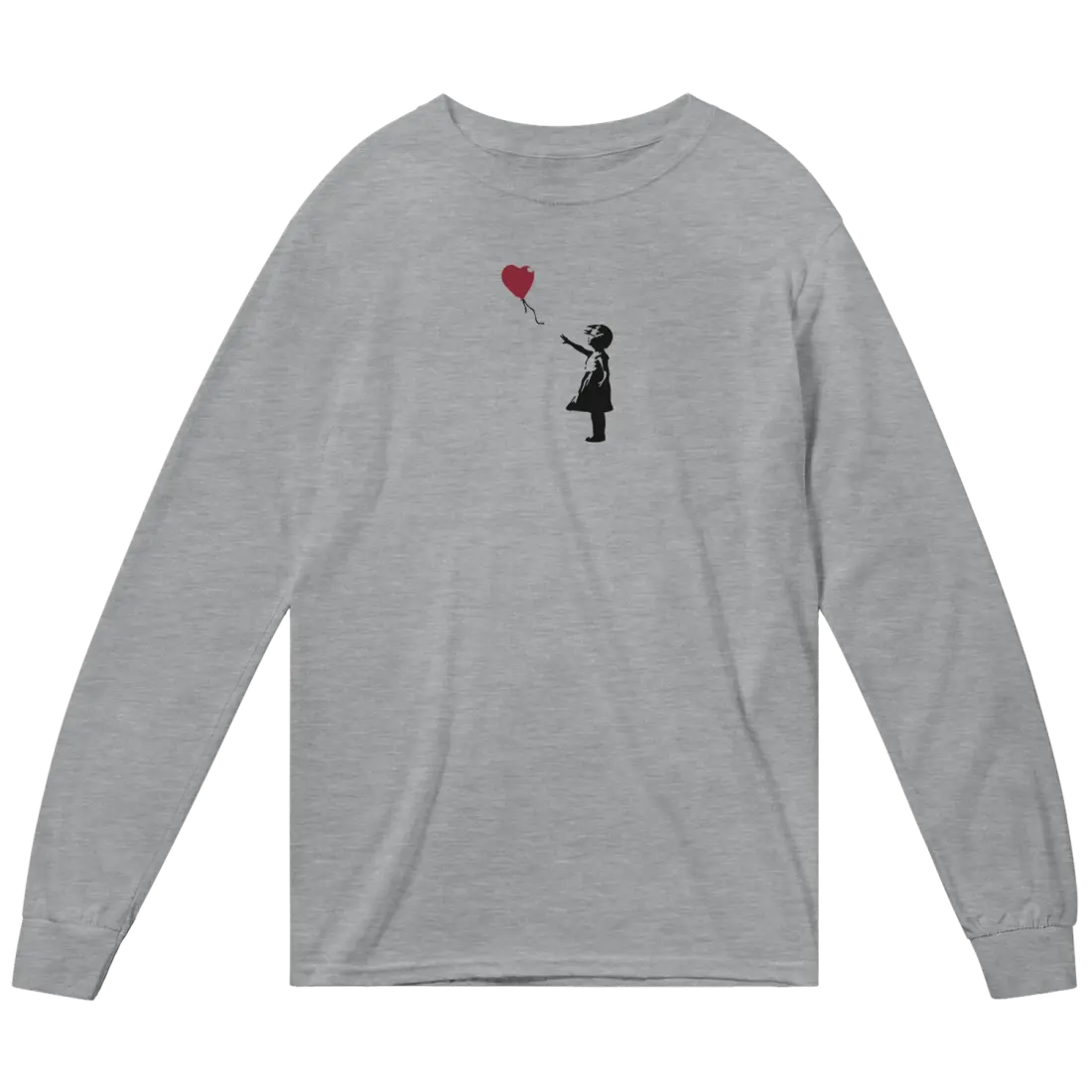 This long sleeve features a famous Banksy artwork, showing a young girl reaching for a red heart-shaped balloon drifting away. Originally painted on Waterloo Bridge, this iconic design has appeared in various forms across London and has been used in support of social causes worldwide.