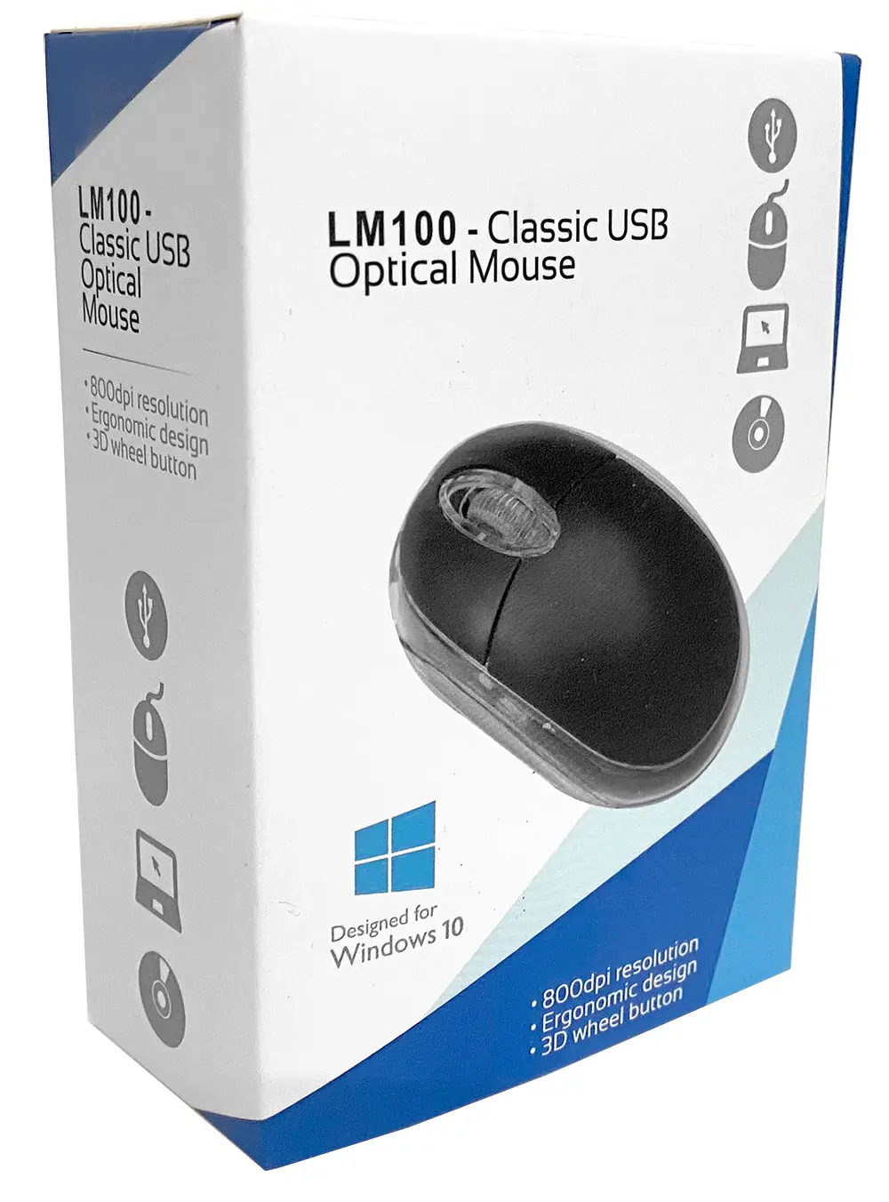 The LM100 is a fully equipped optical mouse with a 800dpi resolution, designed for various office, educational, and business tasks. Its high-quality optical sensor allows for precise use on any surface, making it a reliable choice for accurate positioning, especially on high-resolution displays. Its ambidextrous and comfortable design caters to both left and right-handed users, featuring a 3-button layout and central scroll wheel.