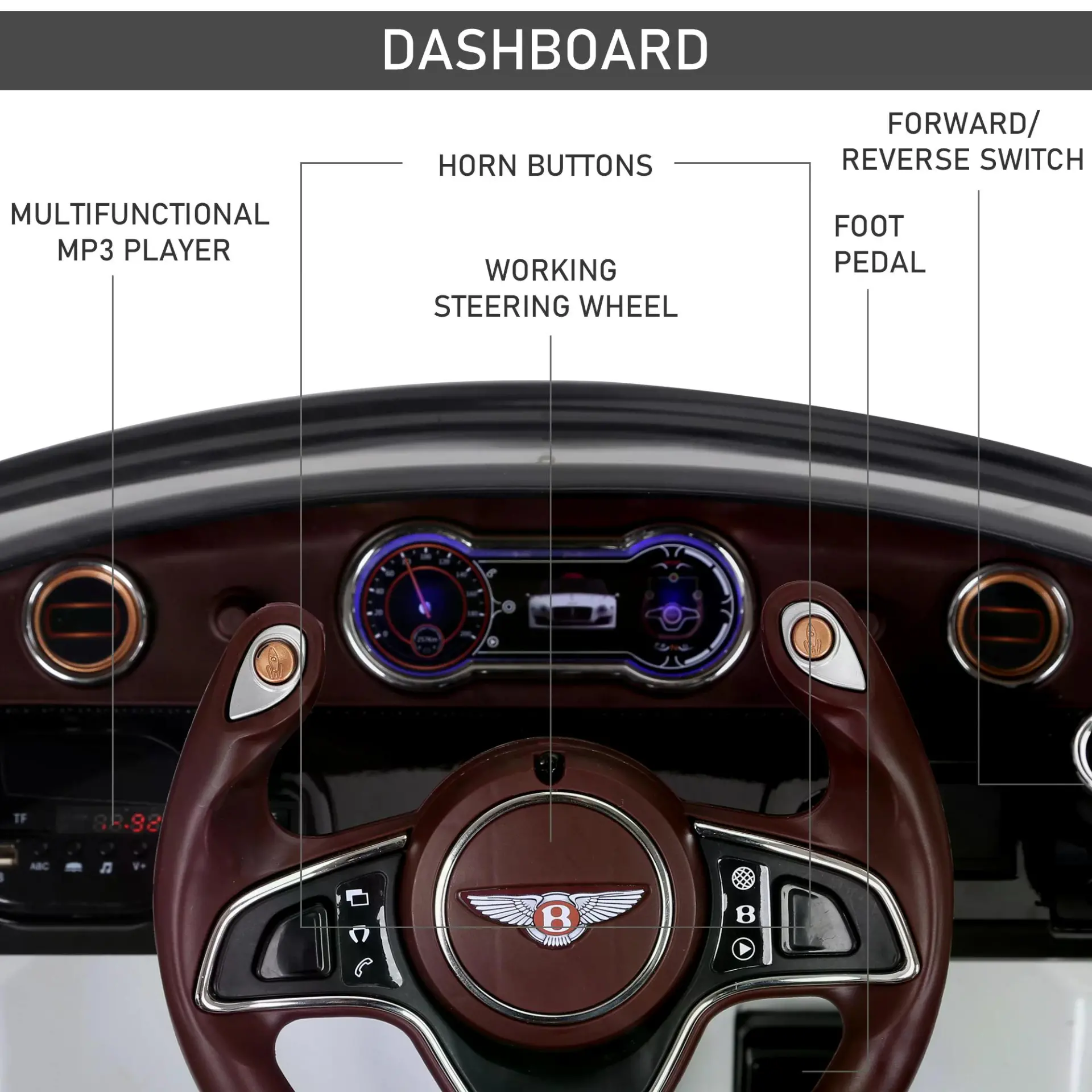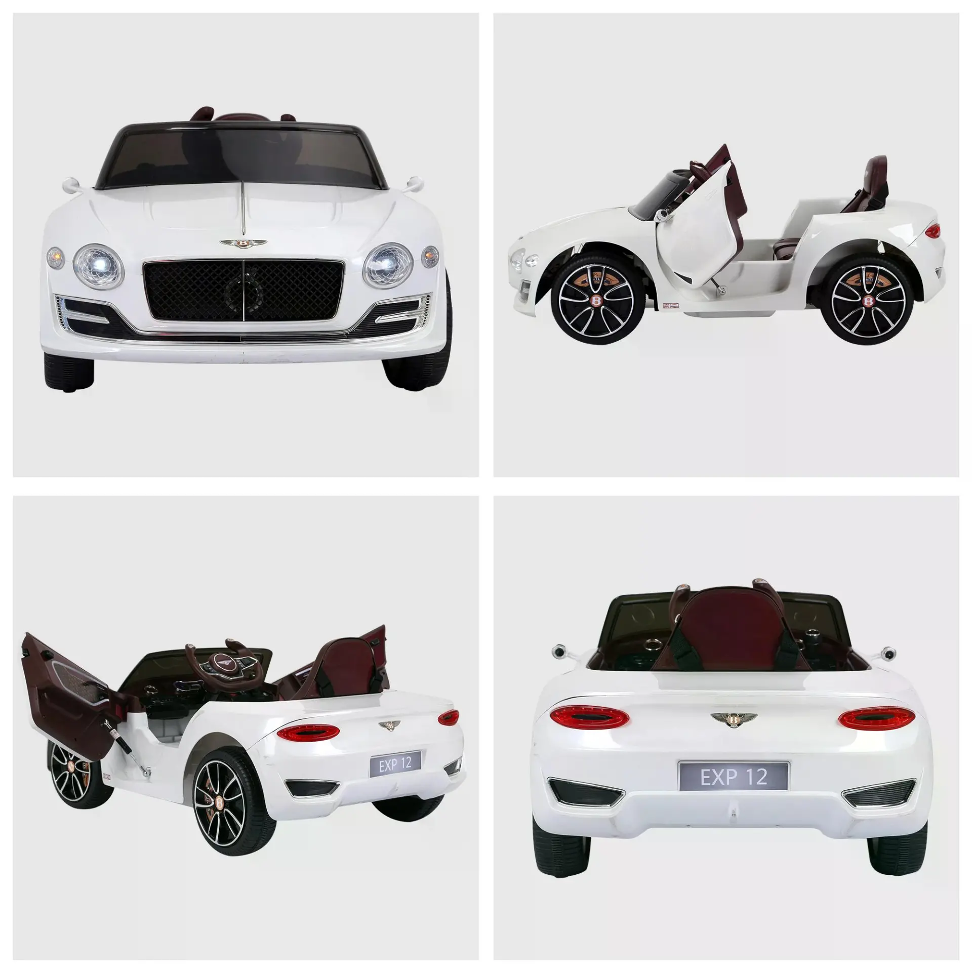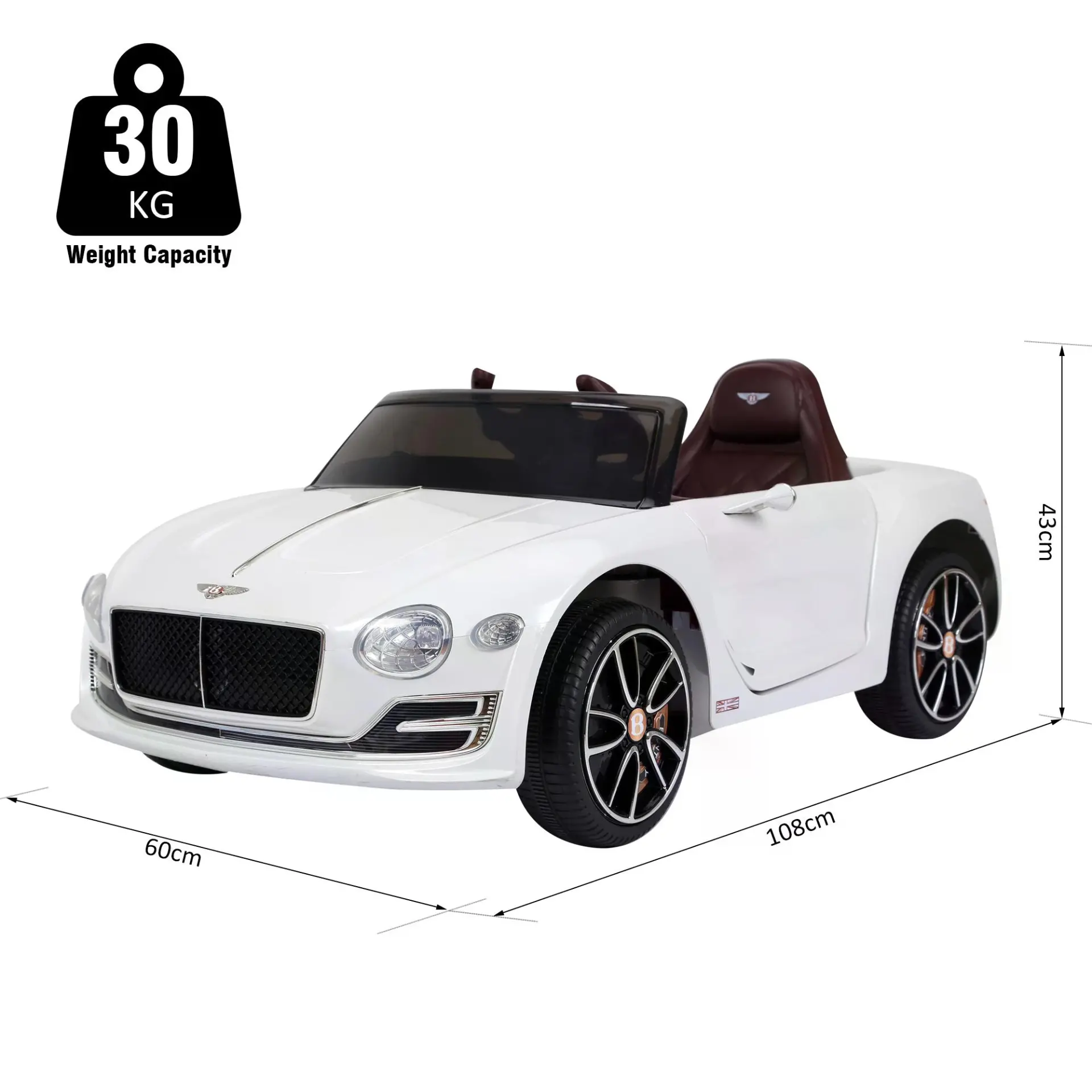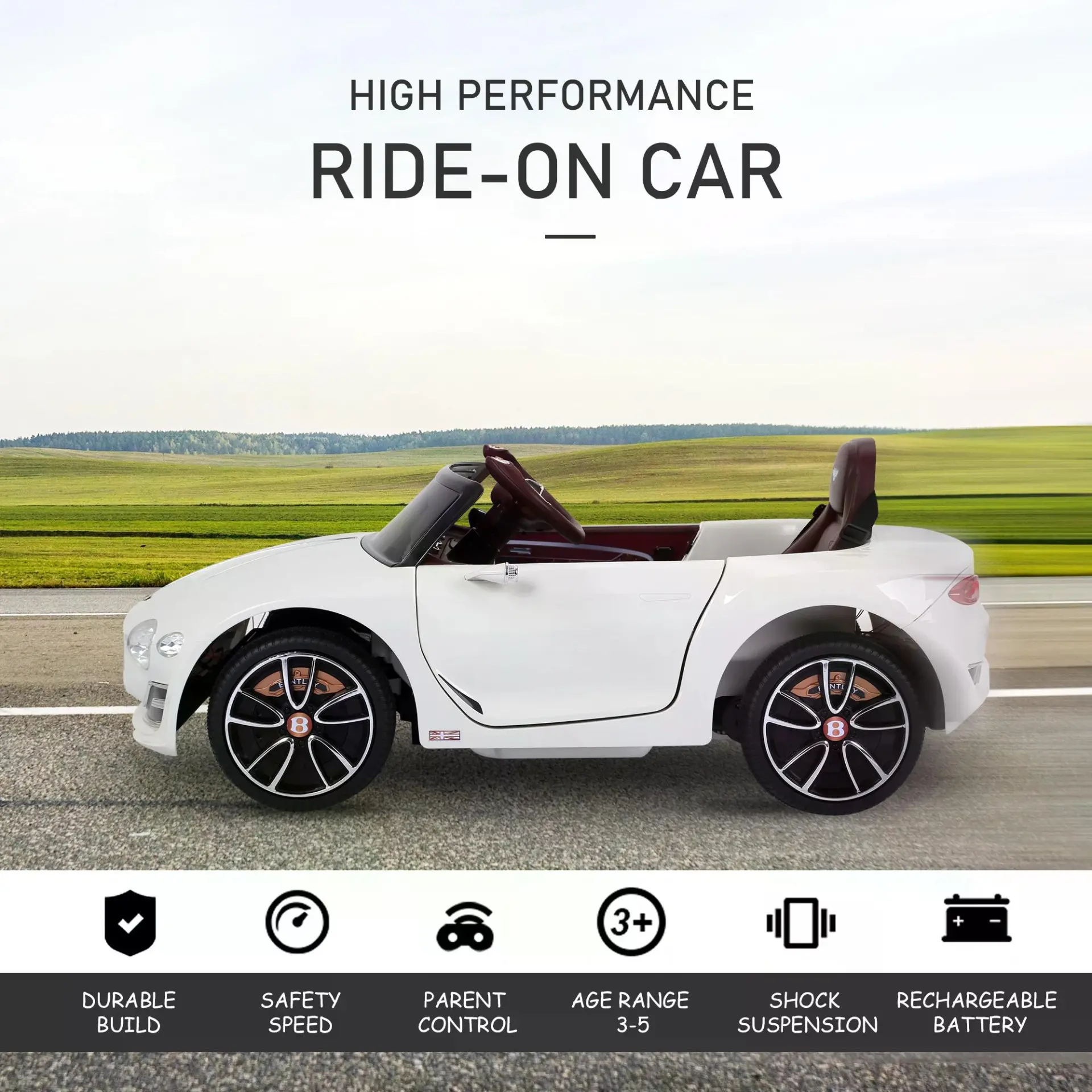 • Bentley style electric ride-on car with twin motors and parental remote control