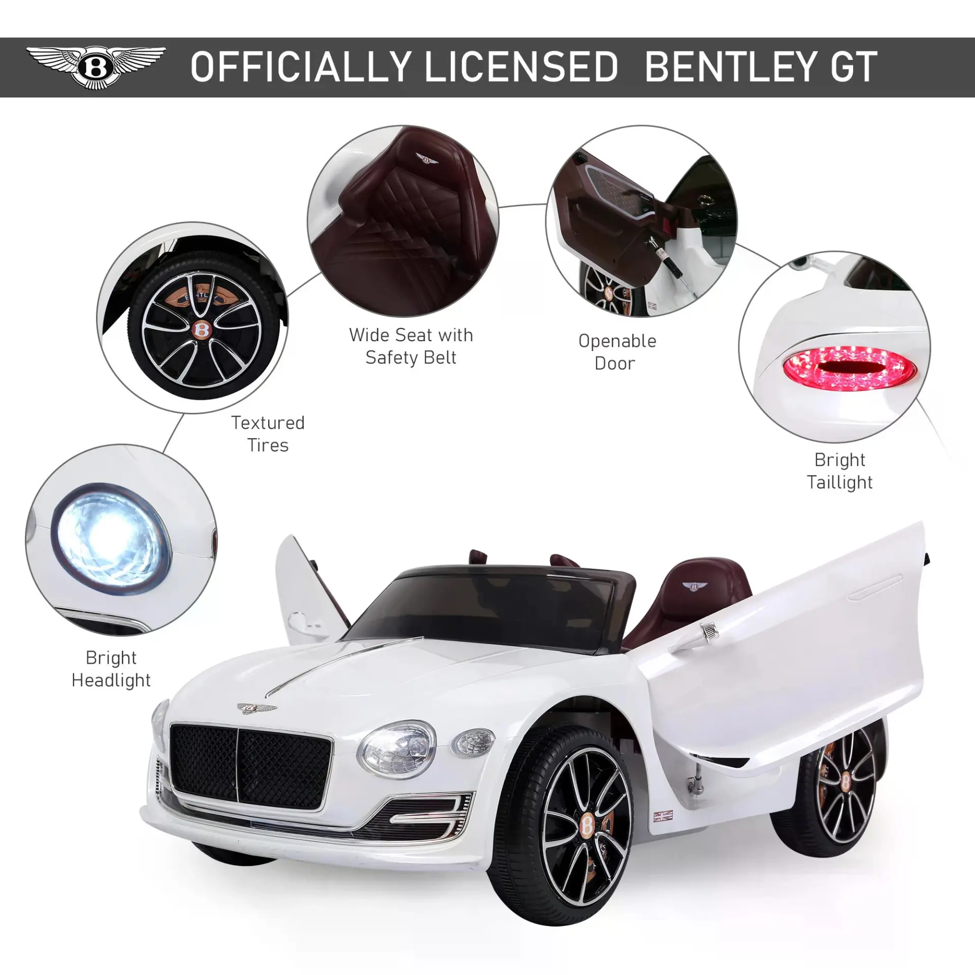 • Bentley style electric ride-on car with seat belt, twin motors and parental remote control