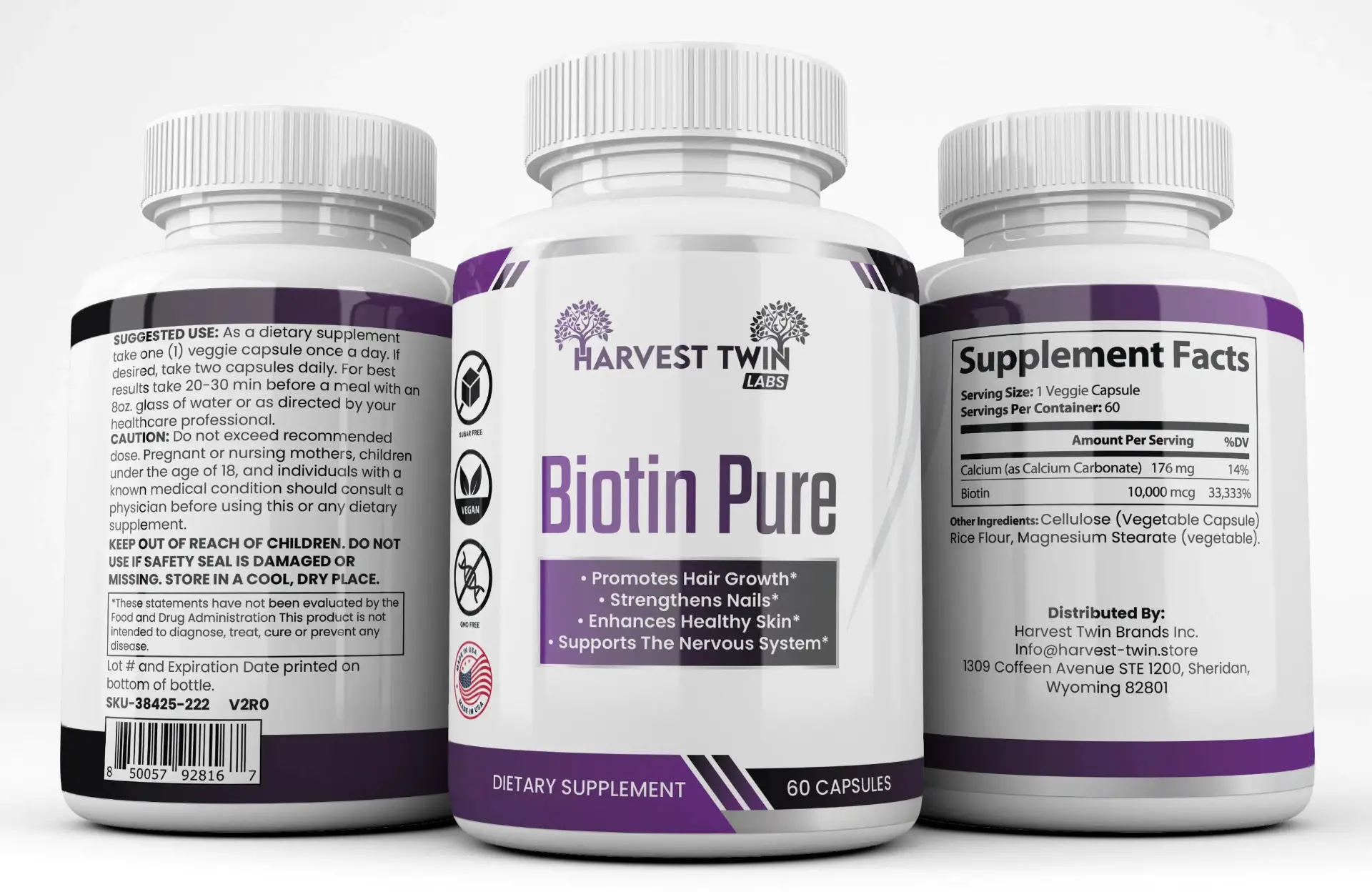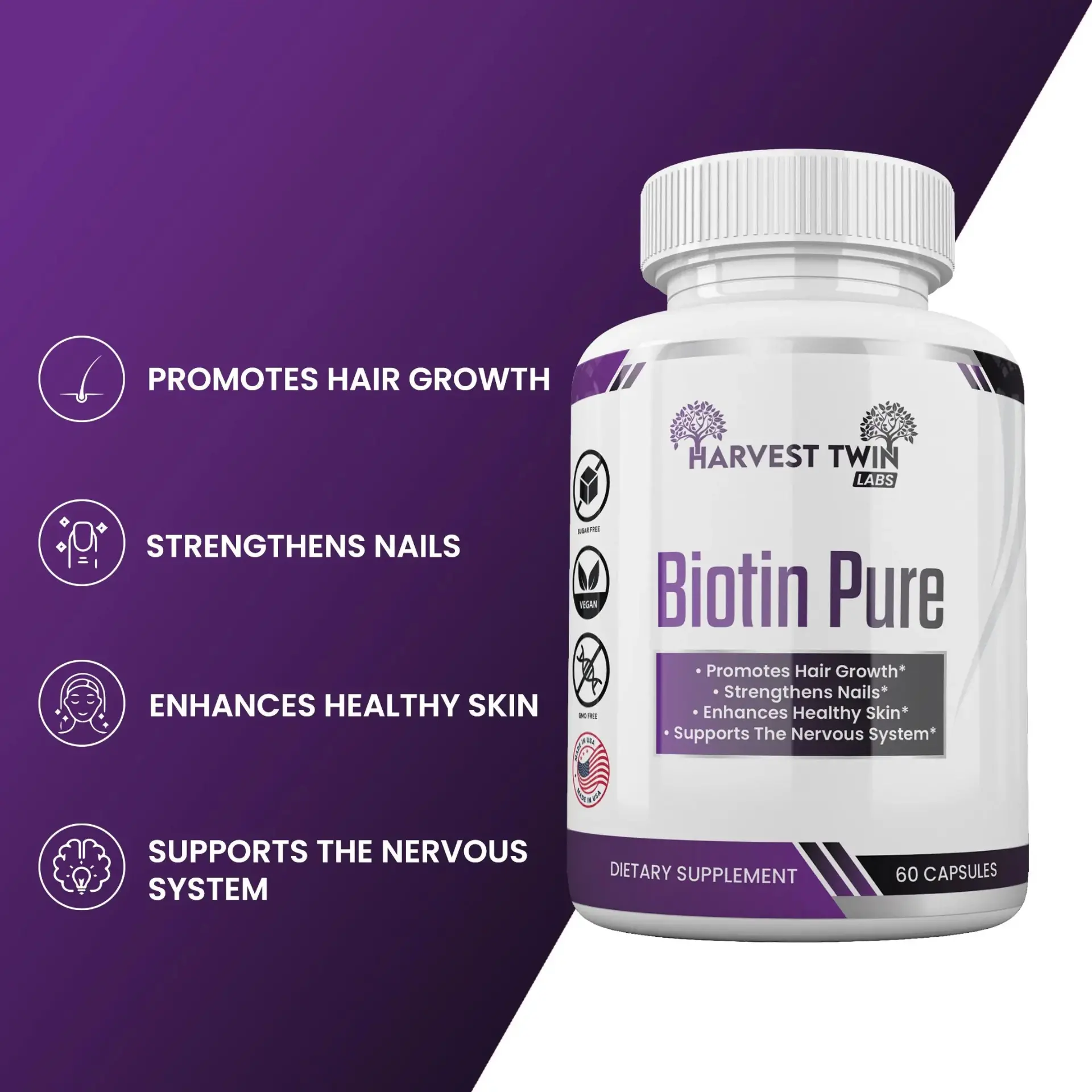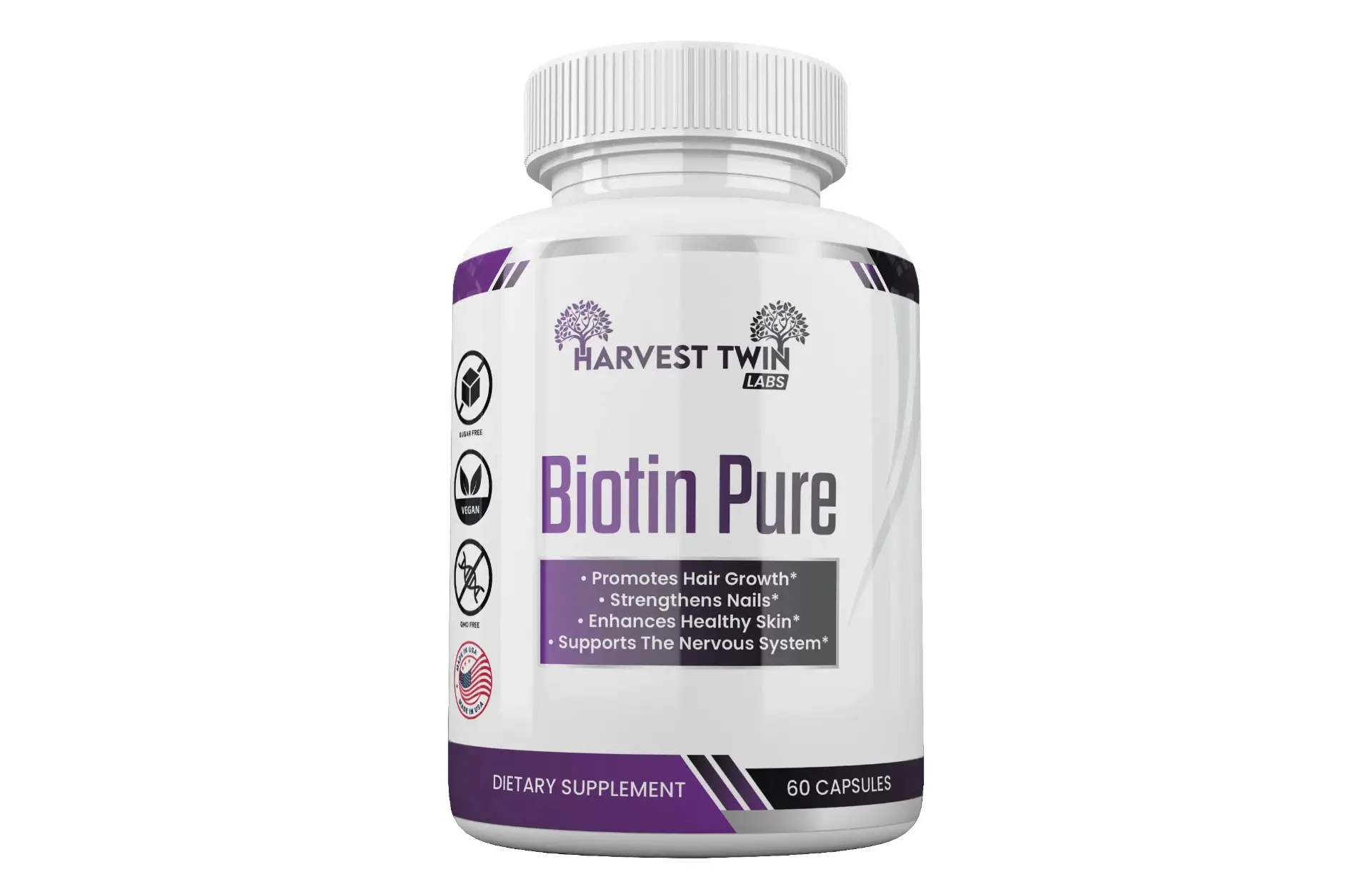 Harvest Twin Labs Biotin Pure helps support stronger nails, promotes hair growth, and enhances healthy skin. Get the beautiful hair, flawless skin, and strong nails you deserve – without compromising your health. Pure Biotin 10 000 mcg per dose. Try Harvest Twin Labs Biotin Pure today.