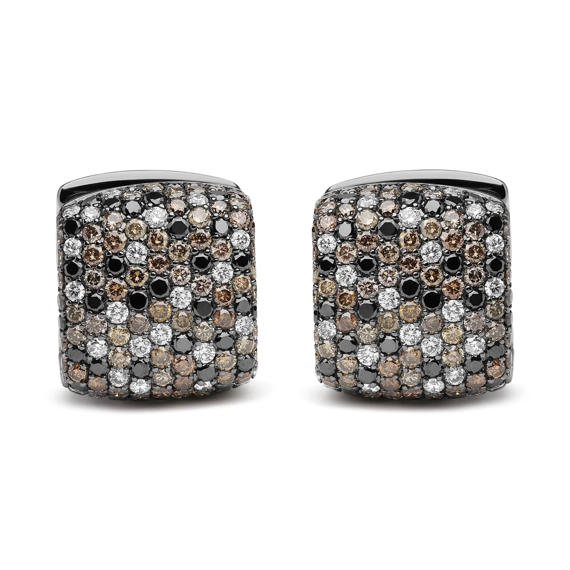 Enhanced by the rich splendor of black rhodium plated 18k white gold, these domed huggie hoop earrings are a style meant to be treasured. An impressive 596 total diamonds shine brilliantly from pave settings in an all-over cluster design so that your ears sparkle from every angle. These diamonds are aglow with a total 12 5/8 cttw with an approximate Brown, Black, and G-H Color with SI1-SI2 Clarity. These glamorous earrings give off a very distinctive fashion statement you will love to wear time and again. lever back findings secure these sparkling earrings in your ears for comfortable, worry-free wear all day long. These earrings measure 20mm in diameter.