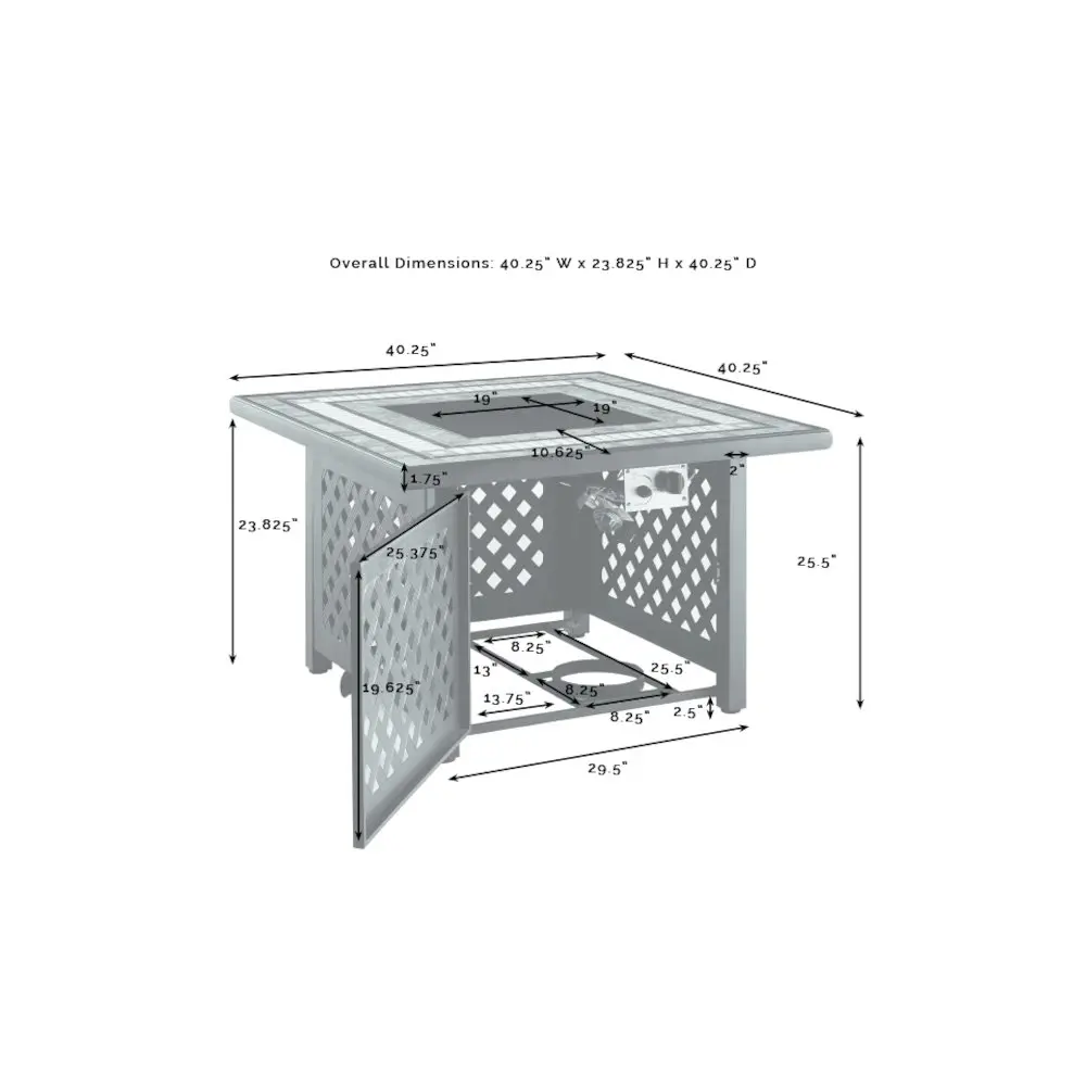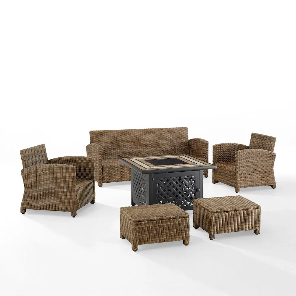 Spend warm summer days and cool summer nights with the Bradenton 6Pc Outdoor Sofa Set with fire table. The patio couch, outdoor chairs, and ottomans are made from all-weather resin wicker with cushions covered in solution-dyed polyester. Constructed from sturdy powder-coated steel, the propane fire pit table offers a place to rest your drink or warm your hands. The slatted top and included lid create a larger tabletop when the fire component is not needed. Controls for the gas and a rack for a propane tank are located inside the fire table’s solid panel base, keeping them close at hand but out of sight. Relax in comfort with the Bradenton patio set.