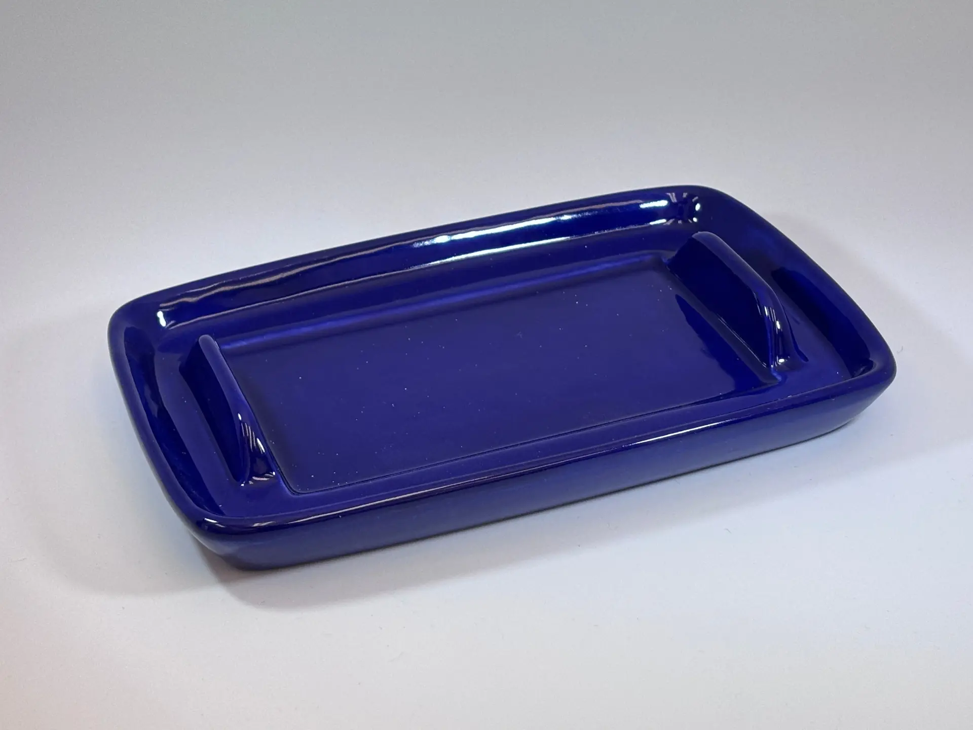 A lovely designed handmade ceramic butter dish with confetti glazed lid and rich royal blue glossy dish that keeps butter fresh and spreadable.