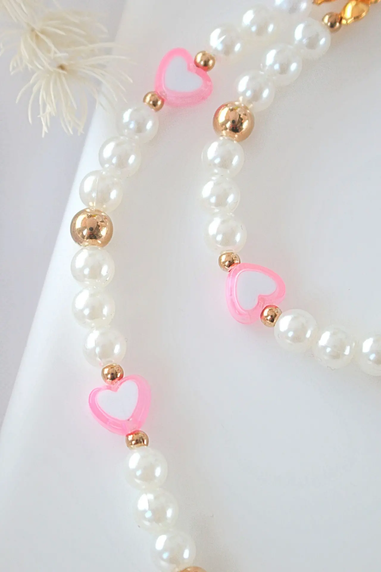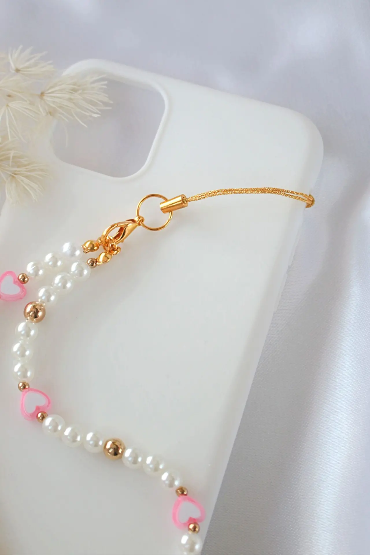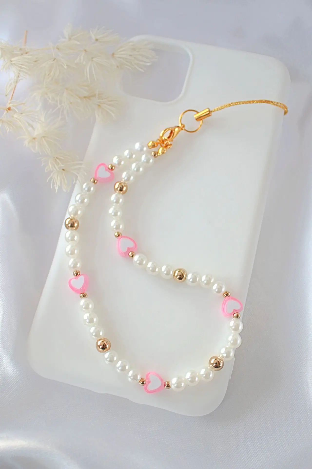 Cute phone lanyard with hearts, pearls and golden beads, made with acrylic pearls beads, stainless steel 18 karats gold plated beads and pink heart beads.
