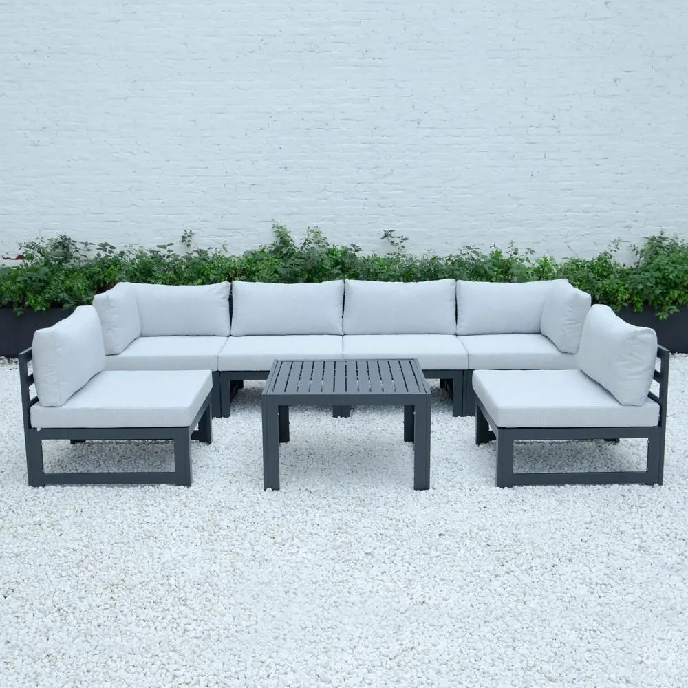 Elevate your outdoor living to new heights with the Chelsea Modern 7-Piece Patio Set. Crafted with meticulous attention to detail, this ensemble combines avant-garde design, unwavering durability, and uncompromising comfort. set comprises 2 corner chairs, 2 armless chairs, 2 armchairs, and a versatile square coffee table. The configuration is designed with flexibility in mind, allowing you to create intimate conversation corners and spacious lounging areas. The Chelsea set stems from its sturdy aluminum frame. Aluminum’s lightweight nature, coupled with its resistance to corrosion, makes it an ideal choice for outdoor furniture. Crafted to withstand the elements, the patio set is both weather-resistant and rust-resistant. Indulge in the plush embrace of removable cushions that adorn the patio set. Designed for supreme comfort, these cushions not only elevate your lounging experience but also bring an element of luxury to your outdoor space. Preserving the integrity of your outdoor flooring, each chair in the patio set is equipped with plastic cap floor protectors. Clear and comprehensive instructions, coupled with all the necessary hardware, facilitate a manageable assembly experience.