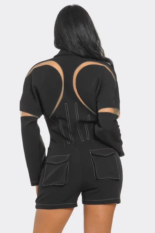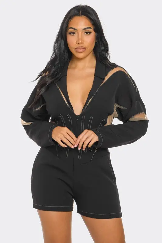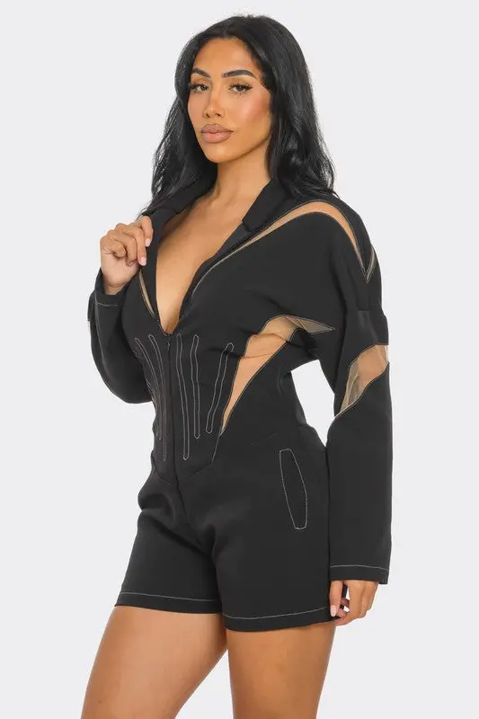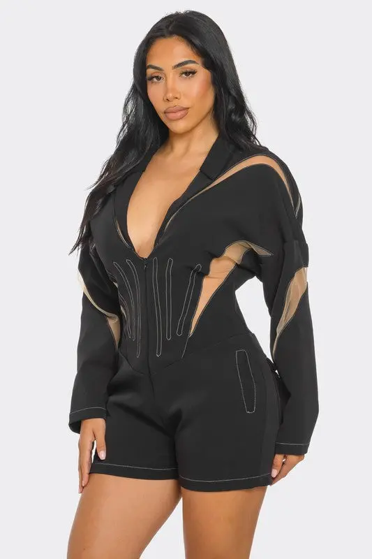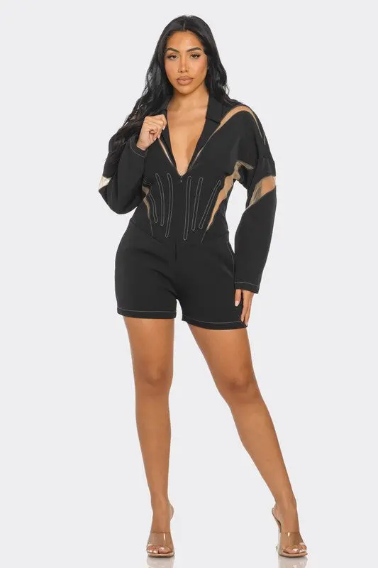 Elevate your wardrobe with our Chic Mesh-Panelled Black Romper. This stunning piece combines modern design elements with classic black, making it a versatile addition to any fashion-forward closet. Perfect for a night out or a chic daytime event, this romper ensures you stand out with style and confidence.