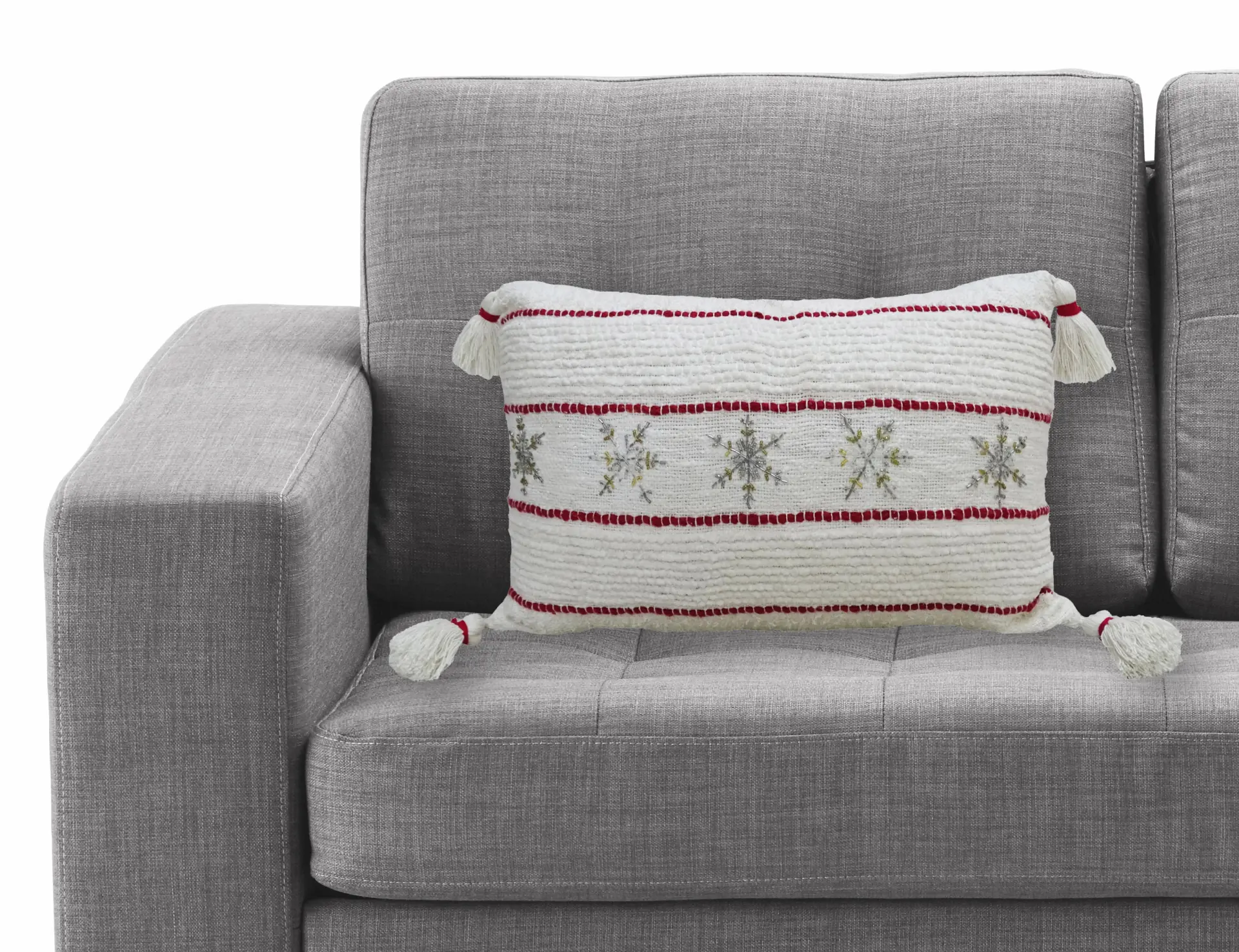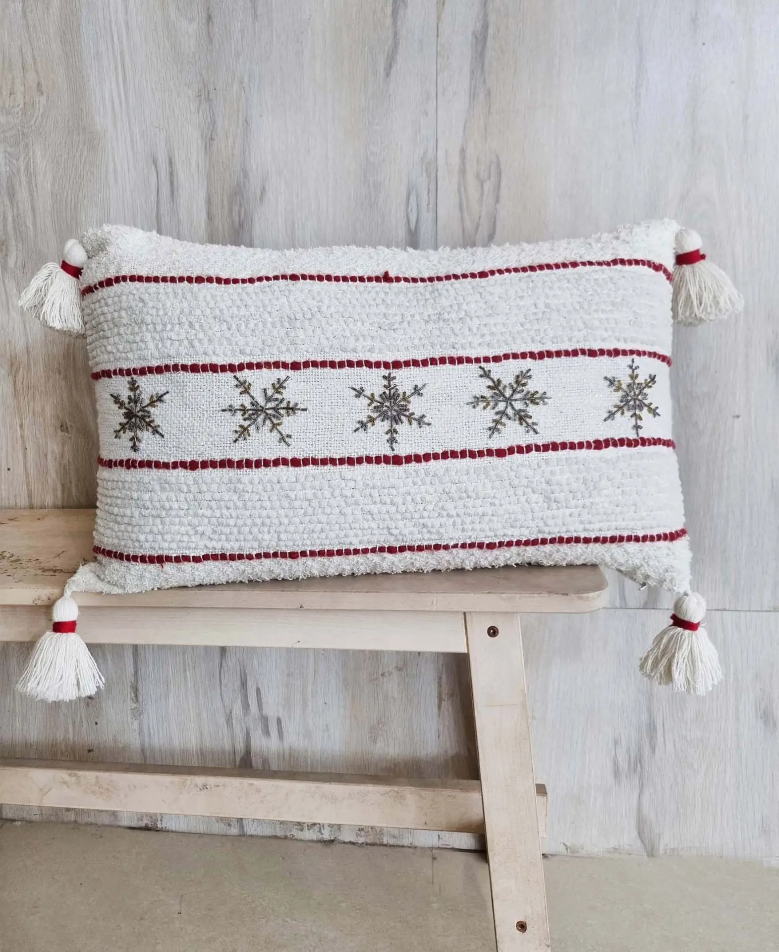 14 inches X 24 inches. Handwoven Textured Pillow with beaded snowflakes.Front-95% Cotton, 5% Polyester Back-100% Cotton handwoven pillow cover Includes: 1 Decorative Pillow with high quality insert. Colorful accent pillow for Indoor Use Only Back of the pillow has solid color with no pattern. Spot Clean only Designed in USA. Cover made in India. Filled and finished in the USA. Zipper Closure for easy removal of insert. Adds a great holiday character in your home Get cozy this holiday season with our Christmas Decorative Pillow. This handwoven pillow features beautiful beaded snowflakes that add a touch of festive charm to your home. The high-quality insert provides comfort and support, while the zipper closure allows for easy removal when it’s time to spot clean. Designed in the USA and made in India, this colorful accent pillow is the perfect addition to your indoor holiday decor. Bring some holiday cheer to your home with our Christmas Decorative Pillow.