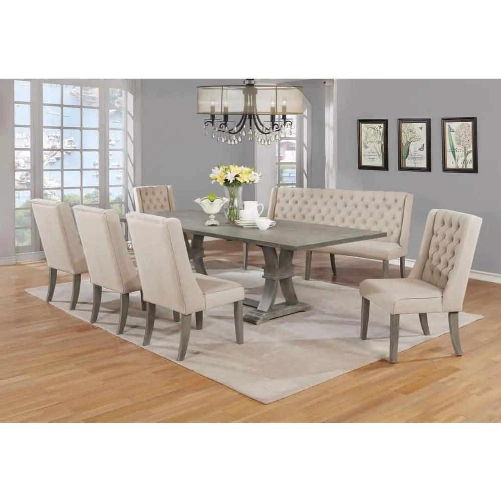 Classic 7pc dining set with extendable dining table with two 16″ leafs in a rustic gray finish, upholstered chairs with tufted buttons and upholstered bench with backrest and tufted buttons. This Set Includes: 1 Extendable Dining Table with Two 16″ Leaves 5 Upholstered Chairs with Tufted Buttons (Available in The Colors Beige and Gray) 1 Upholstered Bench with Backrest and Tufted Buttons (Available in The Colors Beige and Gray)