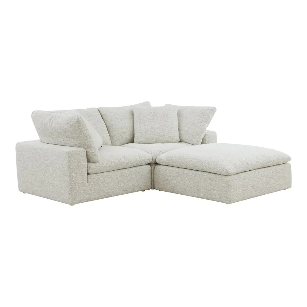 100% NeverFear stain resistant fabric upholstery Feather & fiber mixed blend cushioning; channeled & double wrapped. Regular flipping & fluffing is encouraged to maintain your cushions quality & comfort Solid pine & plywood mixed frame Consists of 3 modular parts: 2 corner & an ottoman for easy switch around