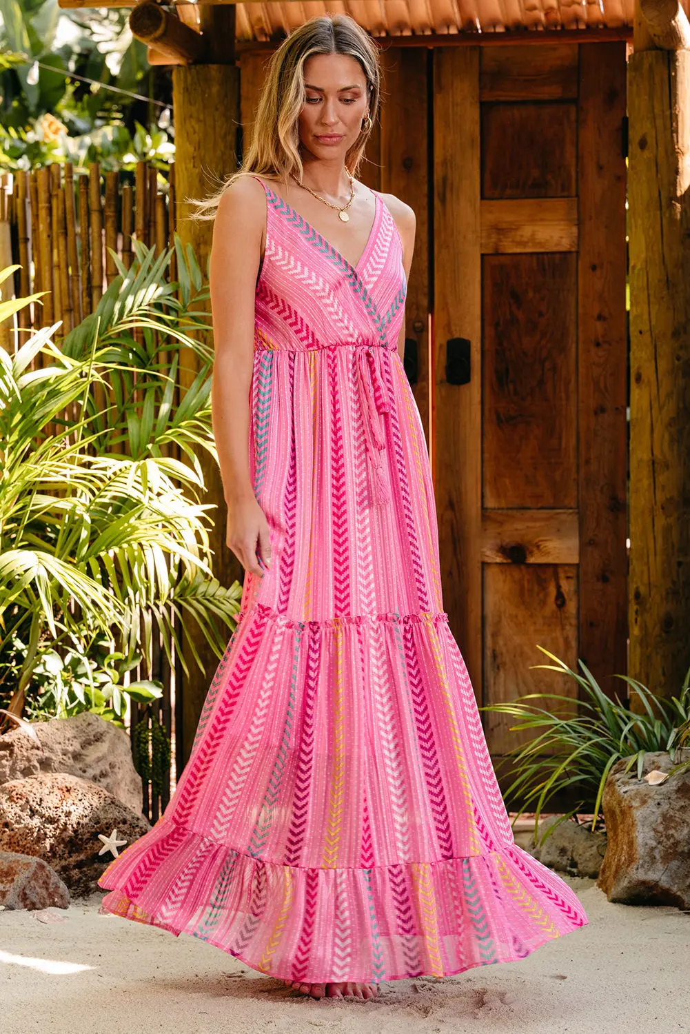 This waist-cinching dress flatters your figure and creates a timeless, elegant look. With a playful V-neck wrap design, it accentuates your curves and adds a touch of bohemian charm with tassel ties. Stay stylish and comfortable in this maxi length silhouette.