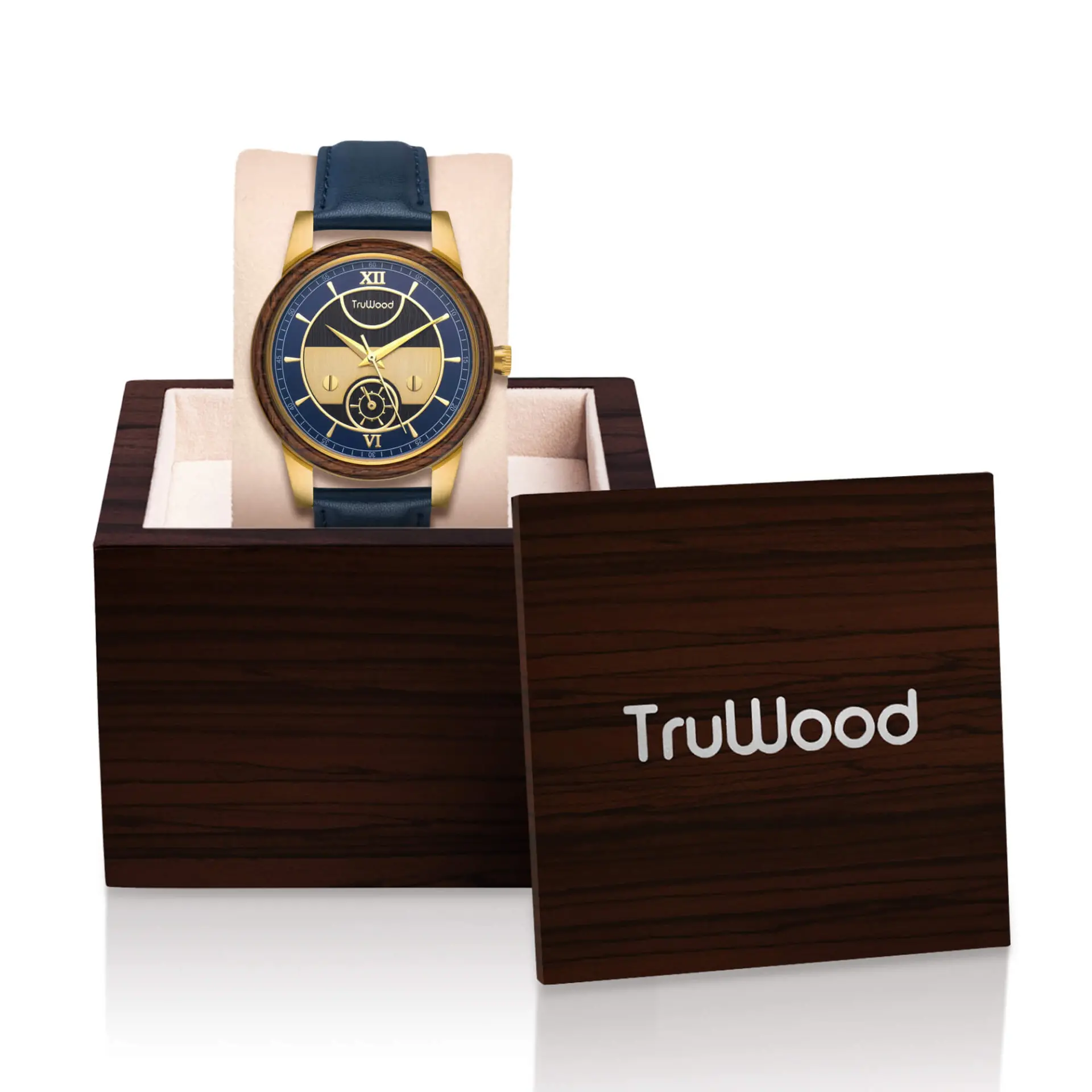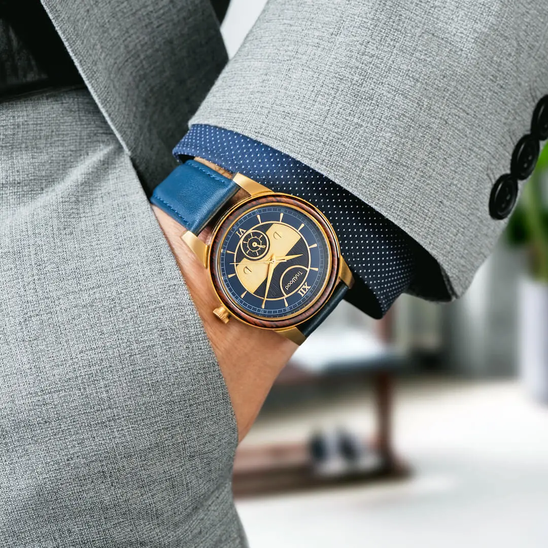 The TruWood Columbus watch is a paradigm shift. Inspired by the human drive to explore in mind, this collection serves as a reminder to discover and achieve the unattainable. Each Columbus timepiece is crafted with hand-picked black sandalwood, masterfully designed after the ships that have traversed our oceans.The genuine blue leather band is held together by gold stainless steel lugs and clasp, topped with a blue dial reminiscent of history’s greatest explorers. This watch rests lightly on your wrist, sporting a subtle sub dial so you can look your best when delving into uncharted territory.
