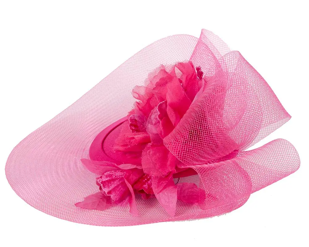 This elegant fuchsia cocktail hat is hand made in Australia from luxurious fabric with large tonal flower bunch. It is an excellent choice for any racing carnivals or special occasion, such as weddings.