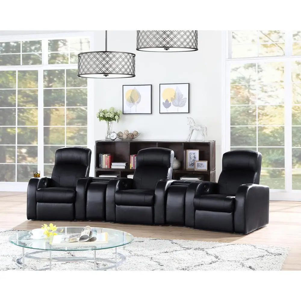 Home theater collection upholstered in black top grain leather everywhere the body touches Manual recline Wall hugger mechanism Pair multiple recliners as needed Two (2) cup holders per seat Console wedges feature soft-closing lift top storage and adds versatility to seating profiles