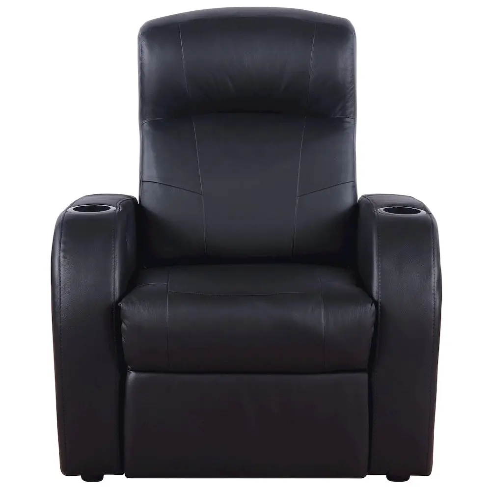 Get the movie theater experience at home with this set of recliners. Customize your home theater with your choice of seating configuration, available in numerous options. Optional center consoles offer unique storage for remotes and small items. Each top grain leather recliner is designed with its own cup holder for your favorite beverage. These black recliners are bound to improve your home theater experience and comfort levels.