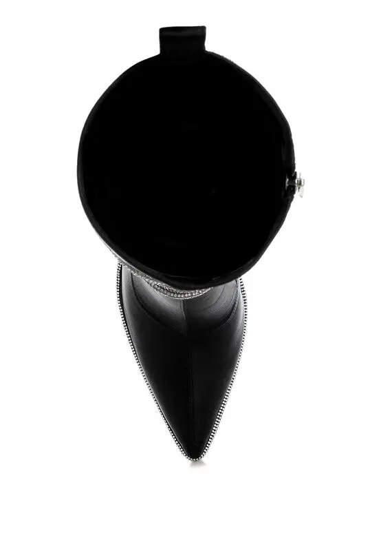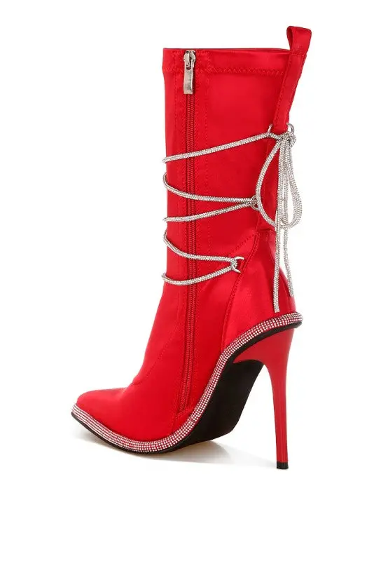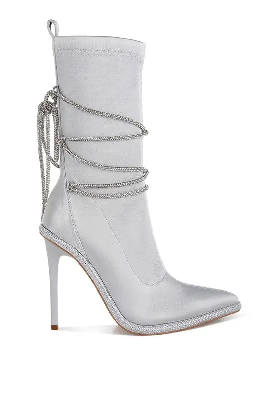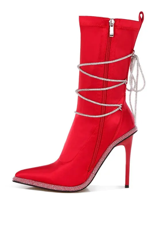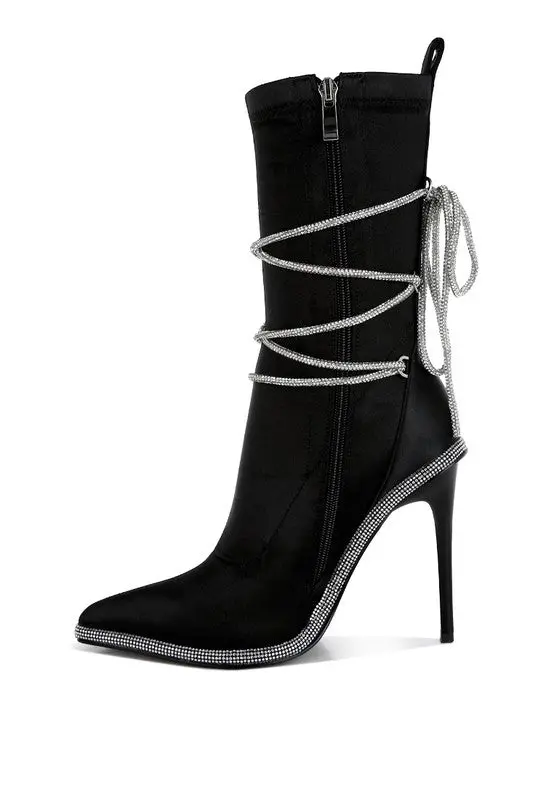The metallic satin boots are so chic and glamorous with the alluring rhinestones embellished strap wrap around. The stiletto boots have pull tabs, making them easy to wear, and comfortable cushion insoles that cut strain.