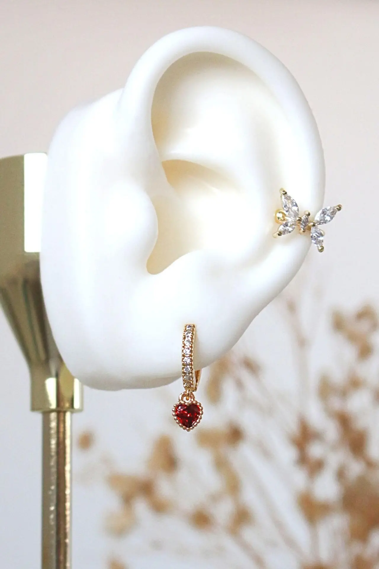 Mini heart hoop earrings encrusted with diamond-cut red colored cubic zirconia, which sparkle beautifully against the light.