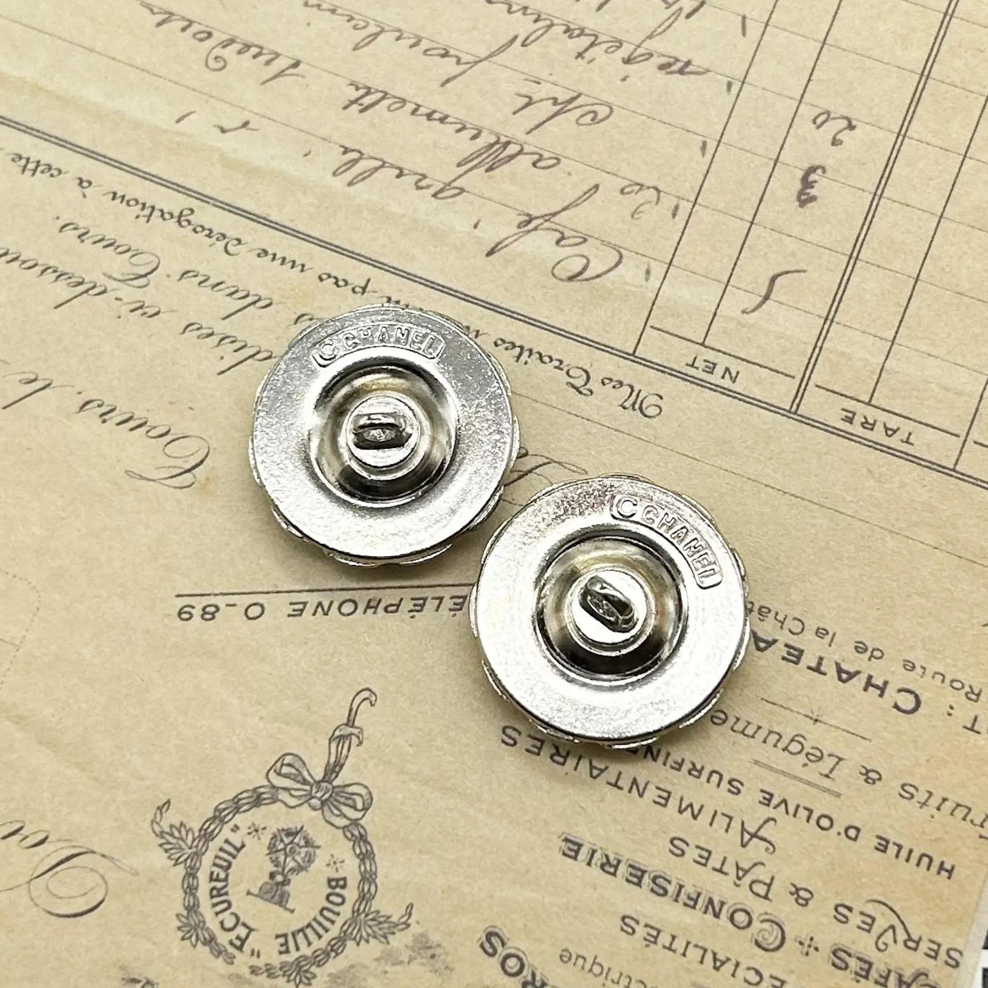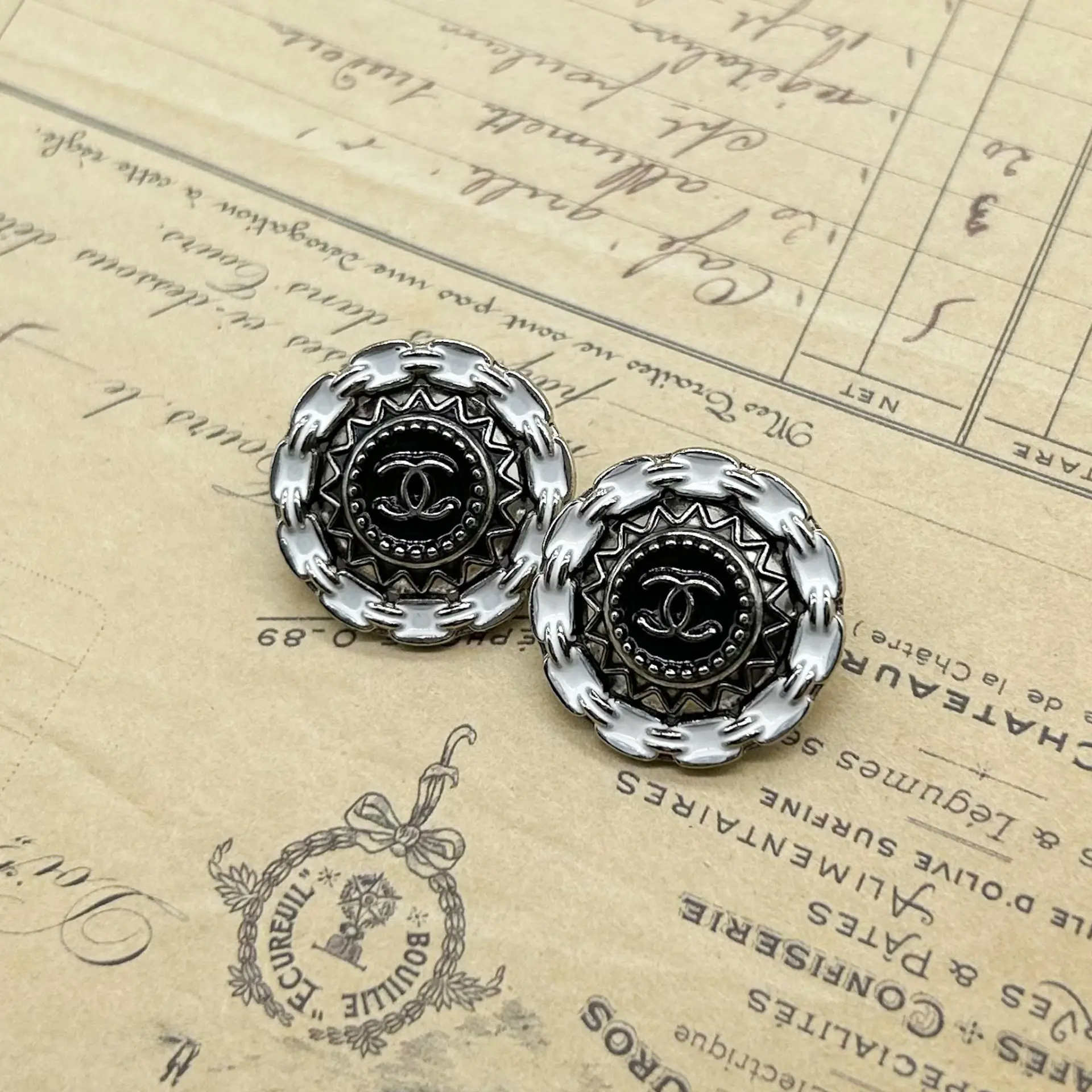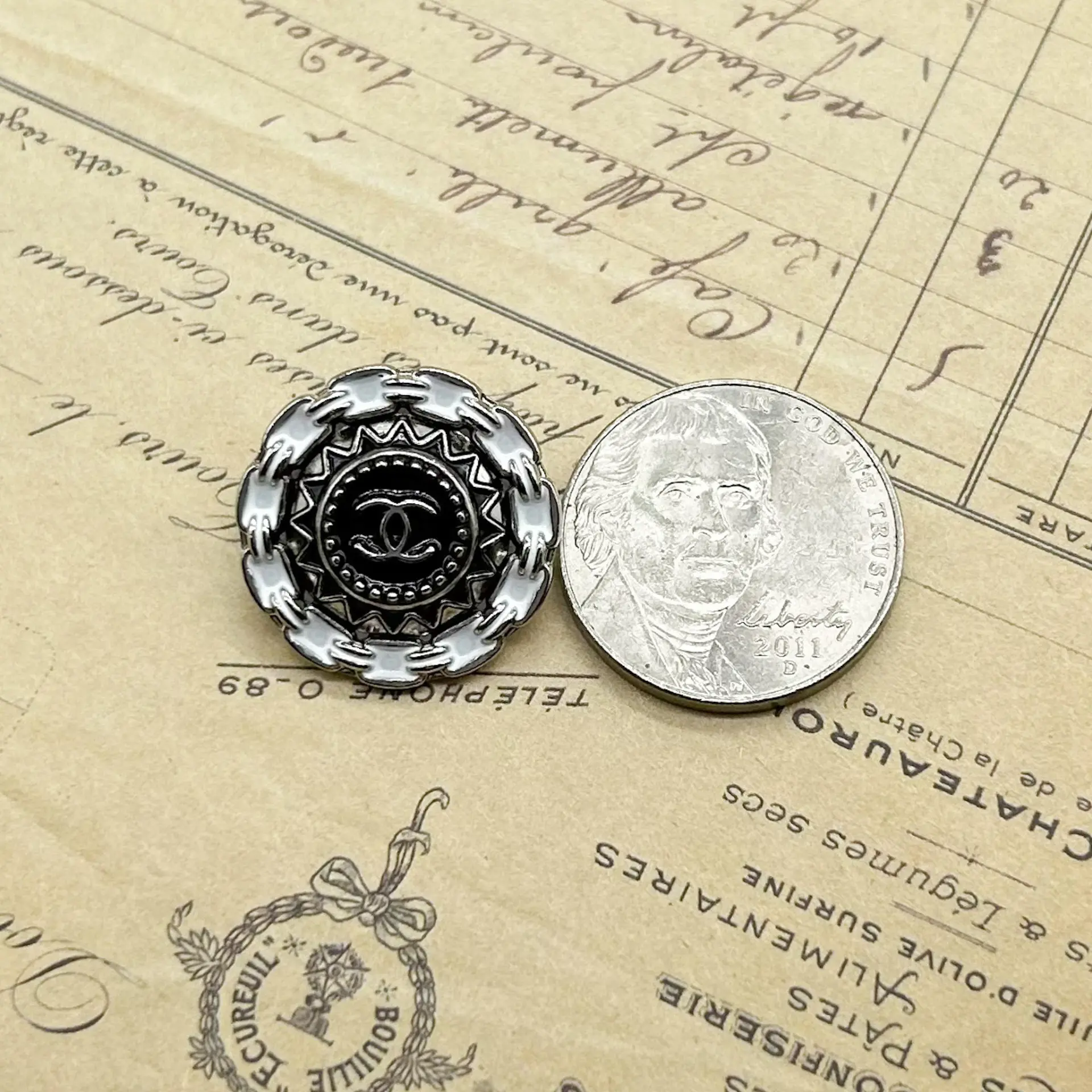 Set of 2 black and white enamel buttons.Silvertonemetal. Stamped on back. 20mm – Please see photos for scale.