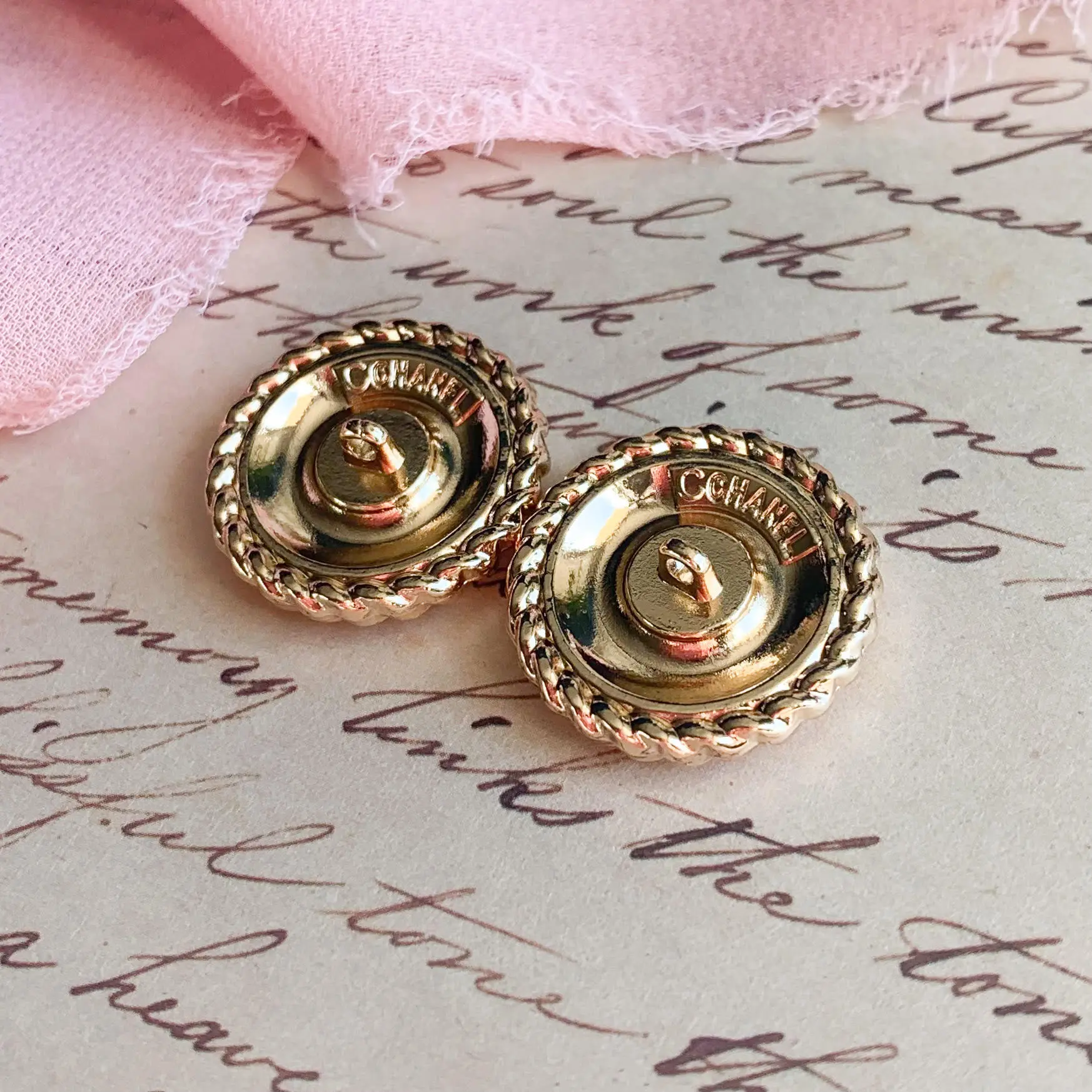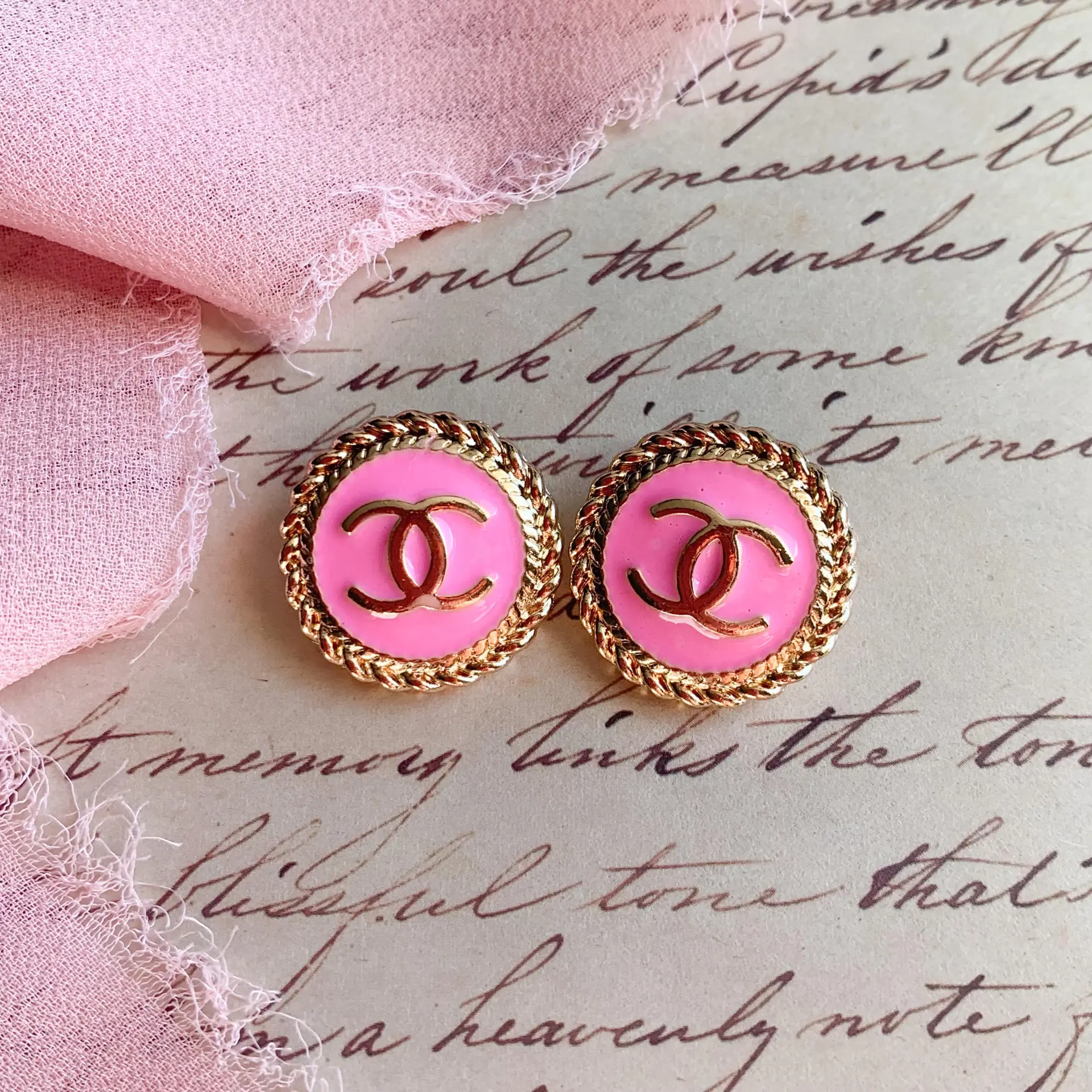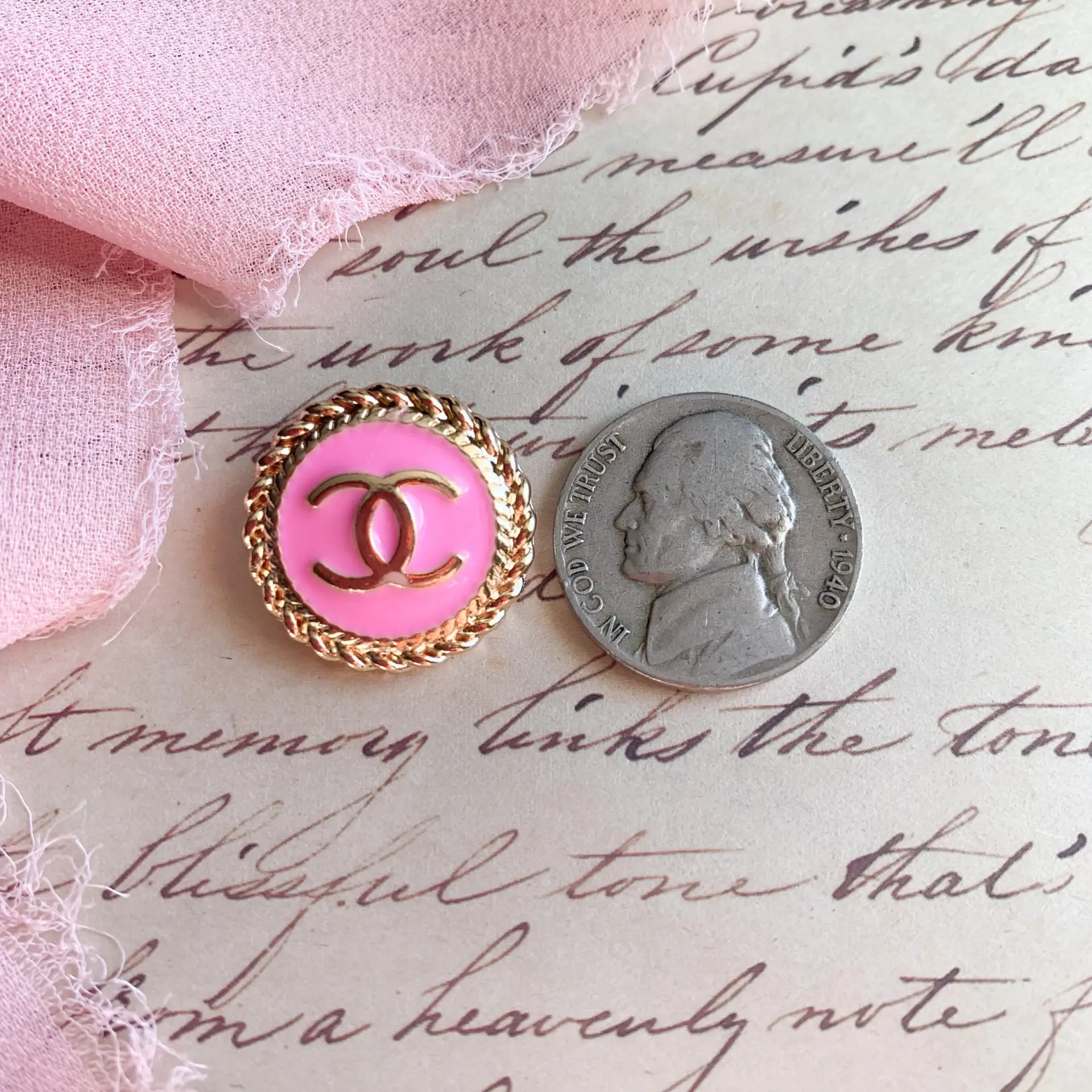 Set of 2 pink enamel buttons. Goldtonemetal alloy. Stamped on back. 20mm – Please see photos for scale.
