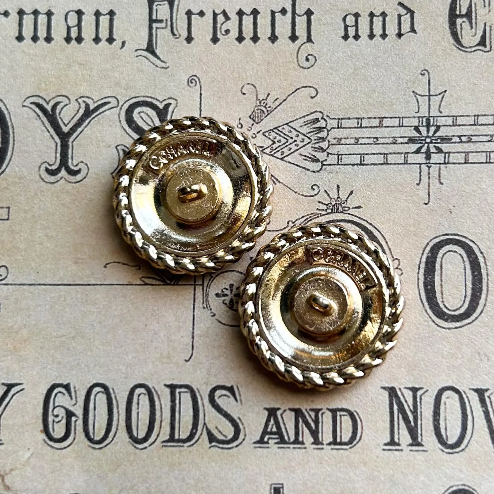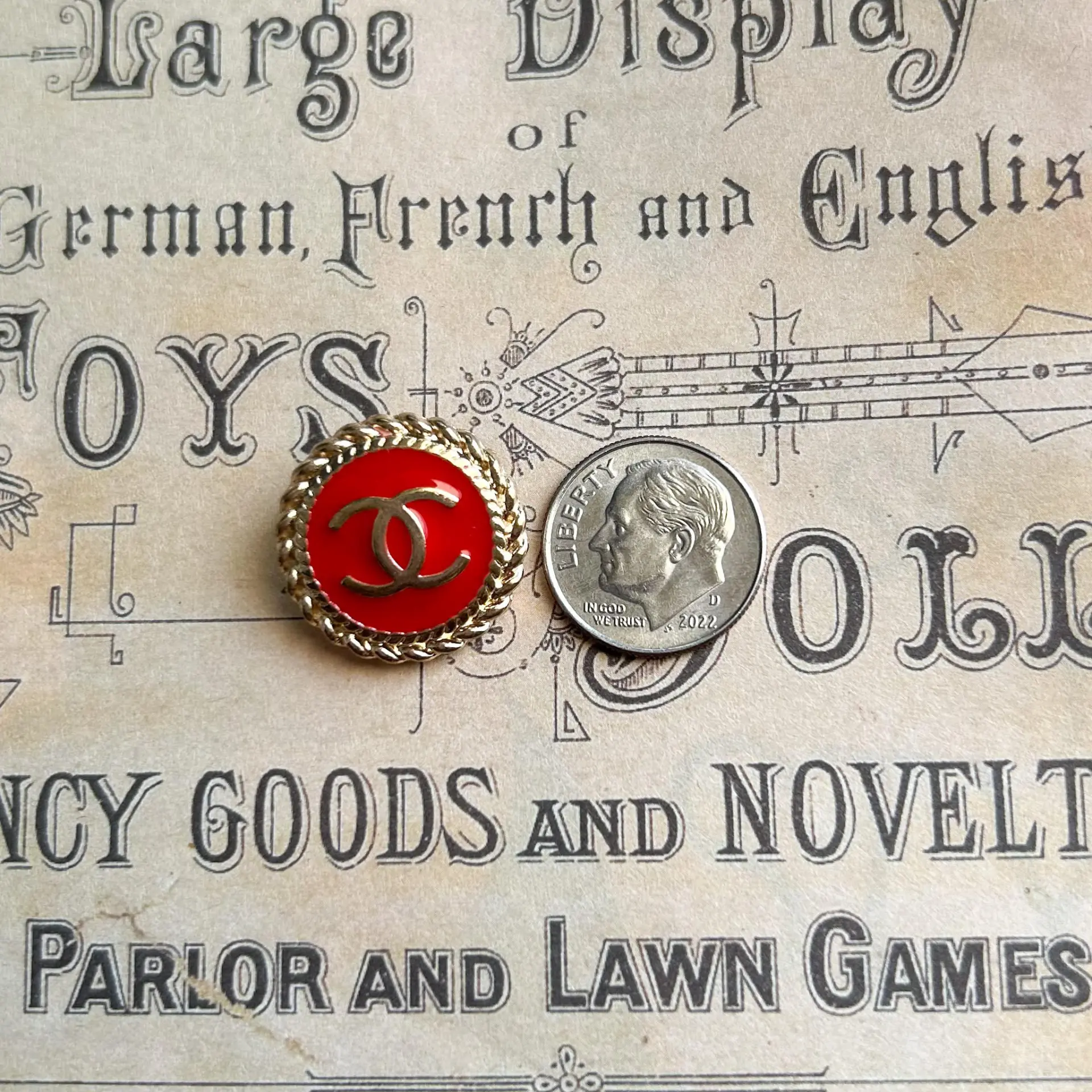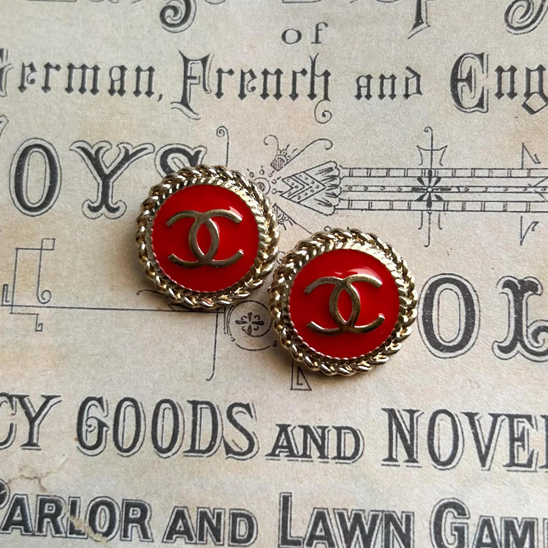 Set of 2 red enamelbuttons. Goldtonemetal. Stamped on back. 20mm – Please see photos for scale.