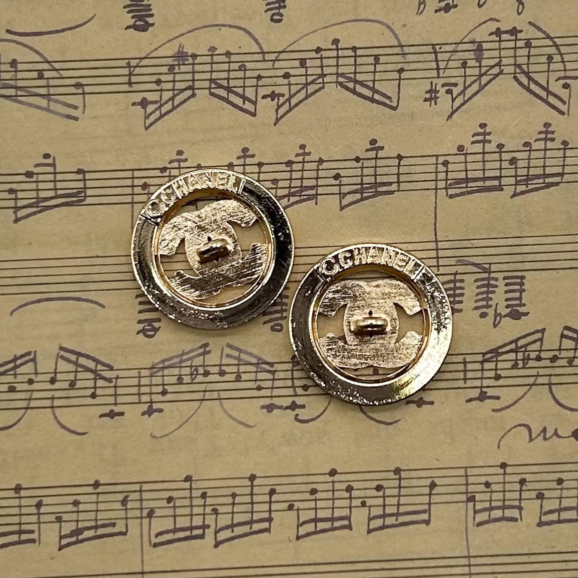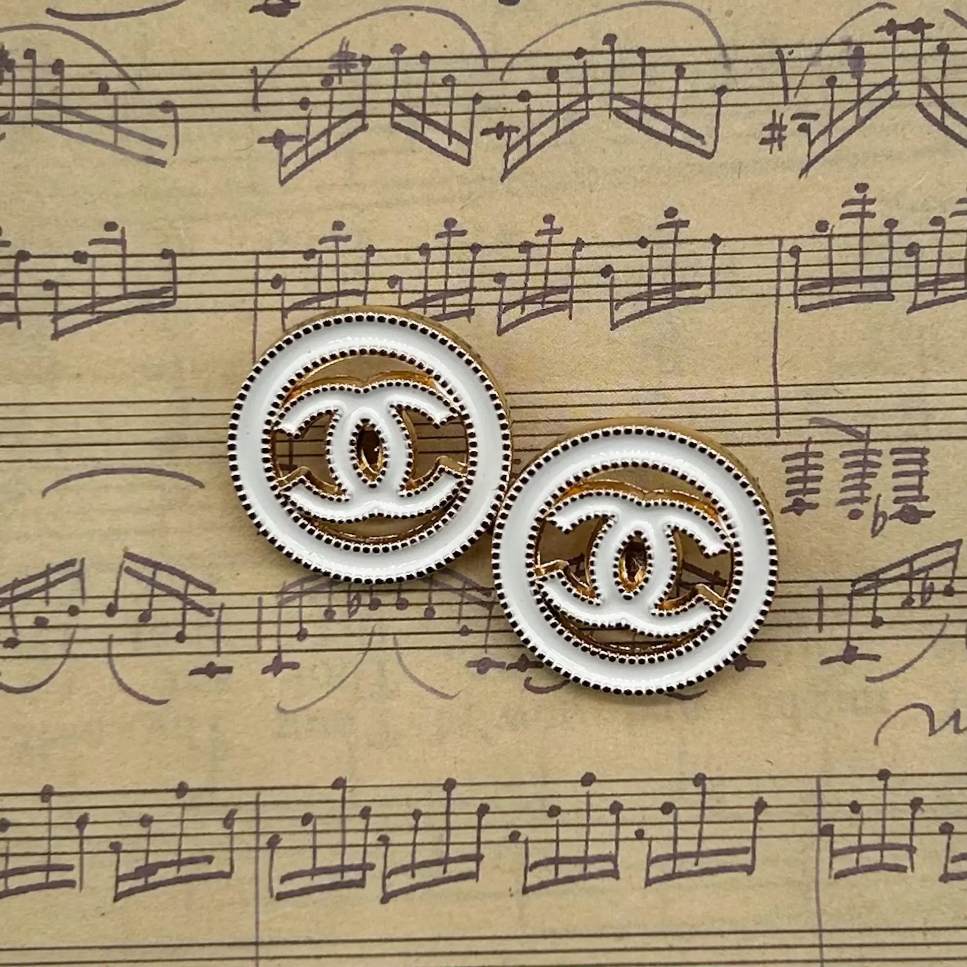 Set of 2 white enamel buttons. Goldtonemetal alloy. Stamped on back. 20mm – Please see photos for scale.