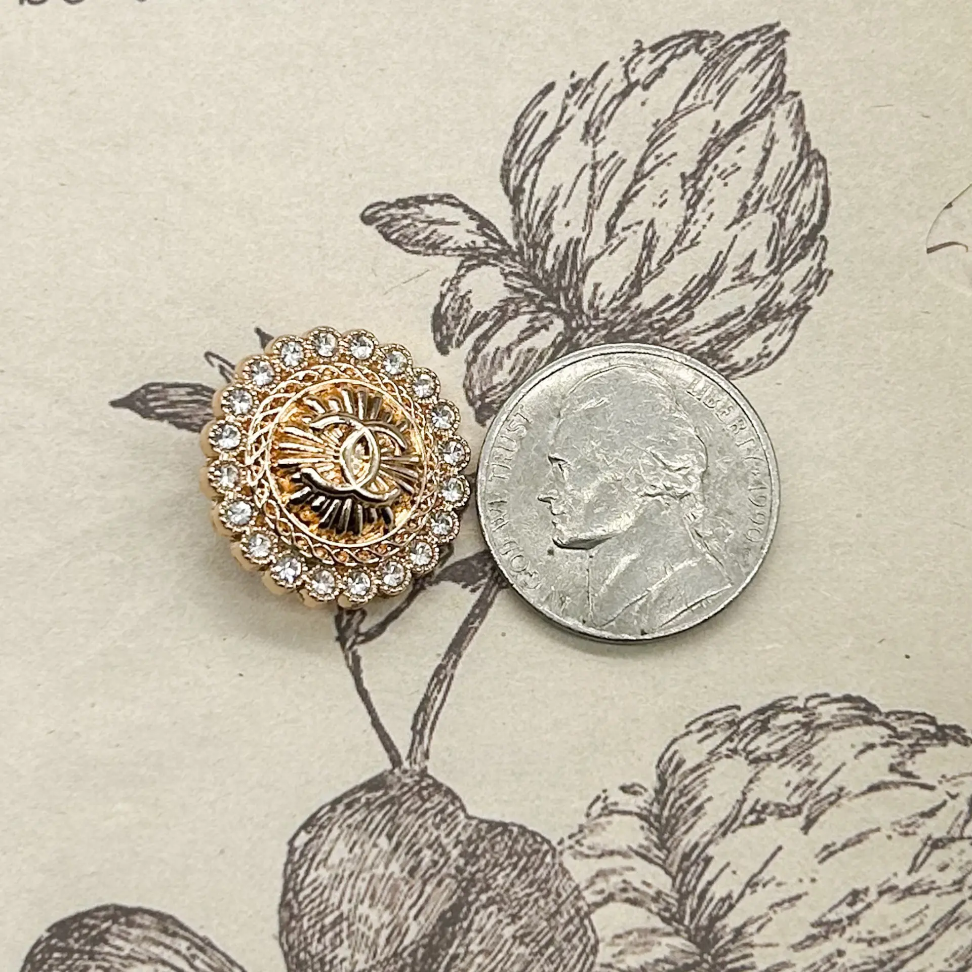 Set of 2 round buttons with rhinestone accents. Goldtone metal. 20mm – Please see photos for scale.