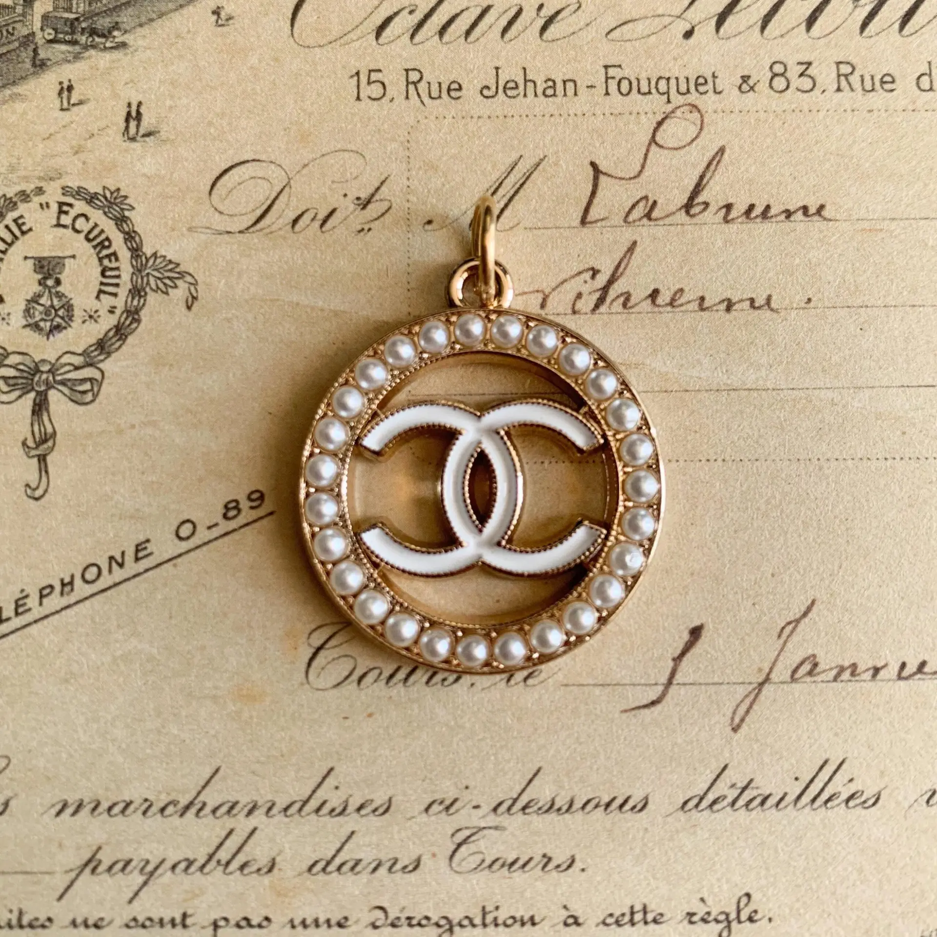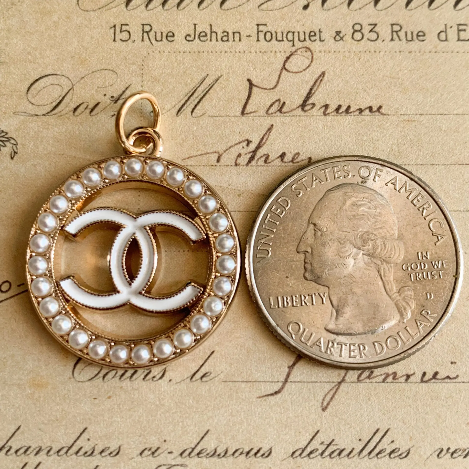 Zipper pull with faux pearl accents. Goldtone metal. Stamped on back. 24mm – Please see photos for scale.