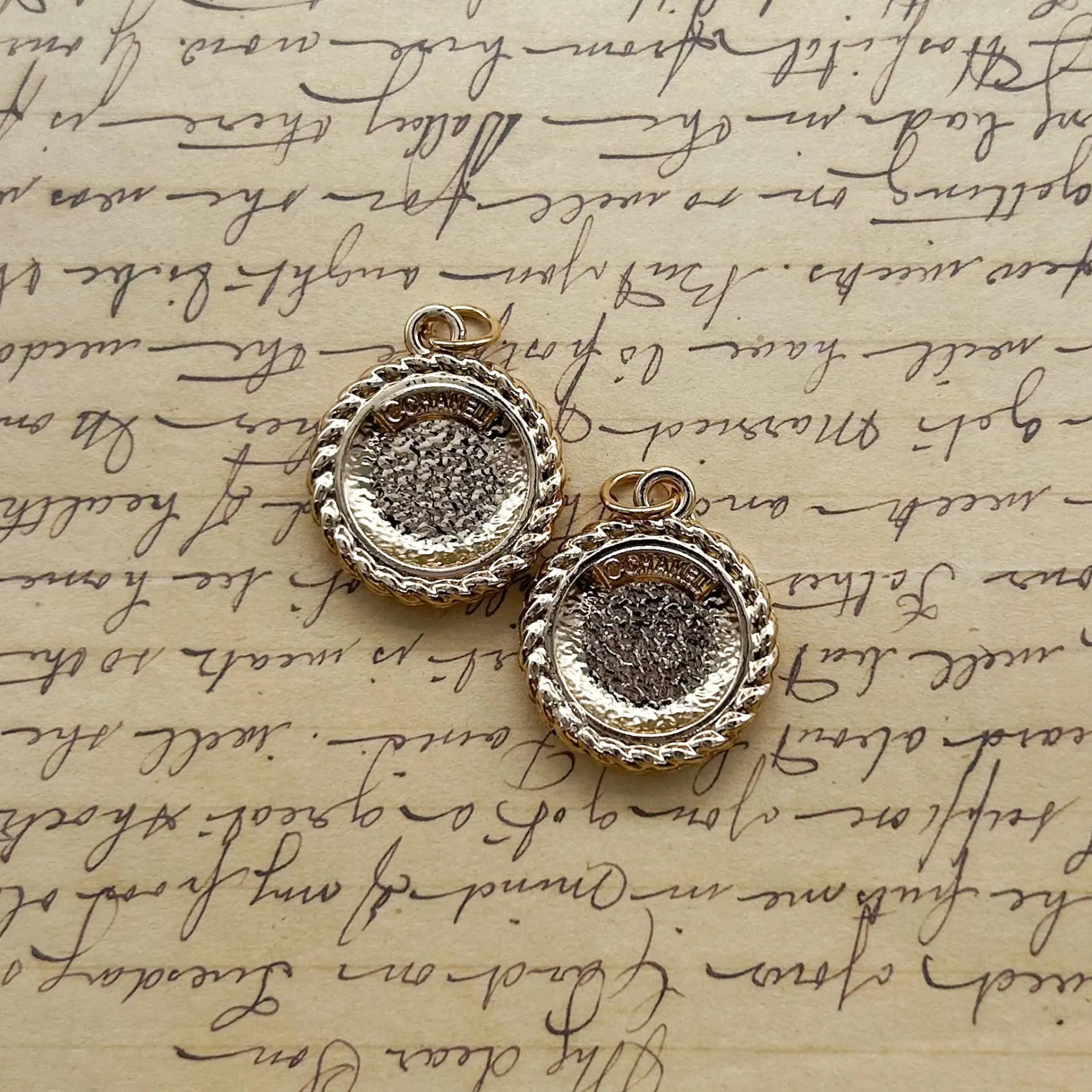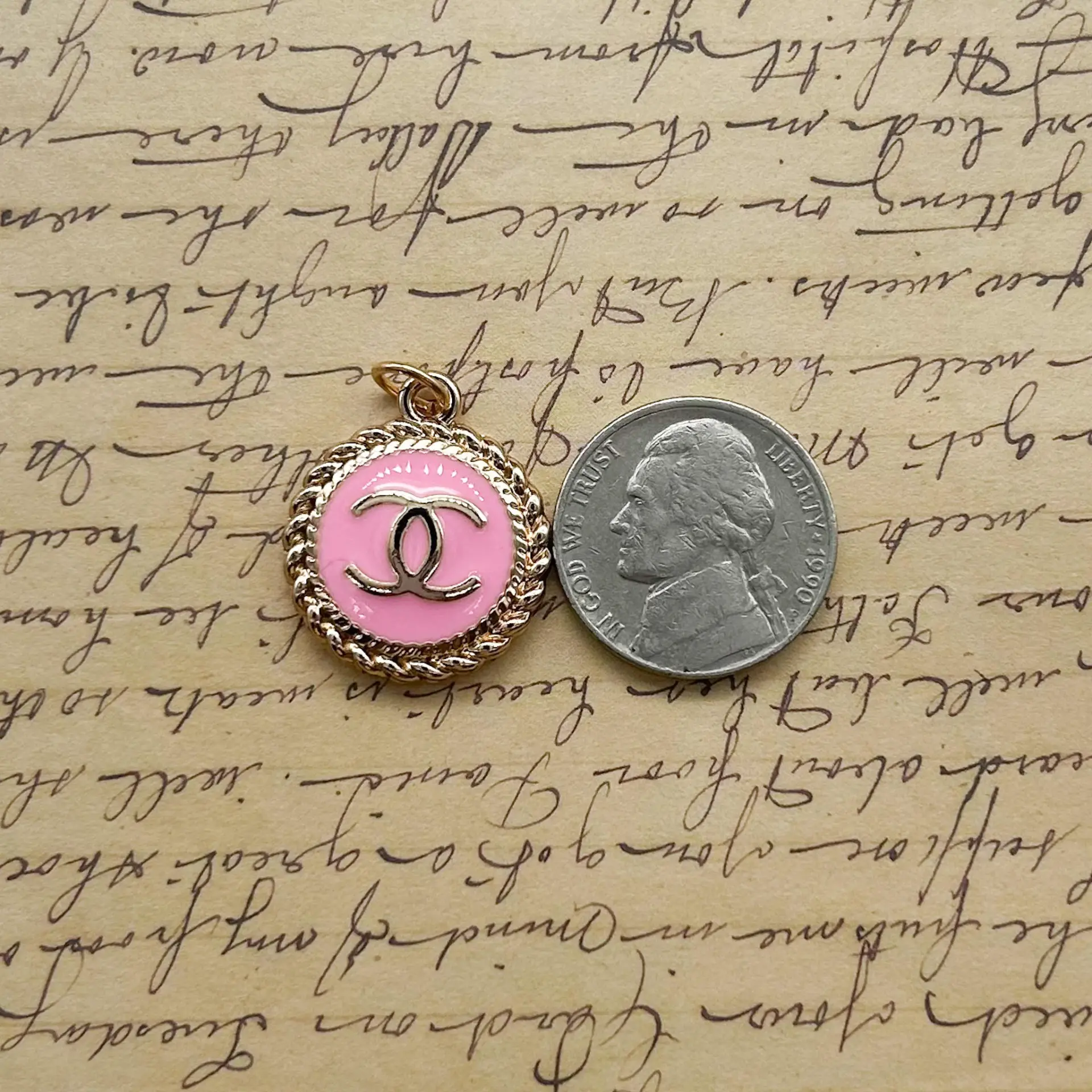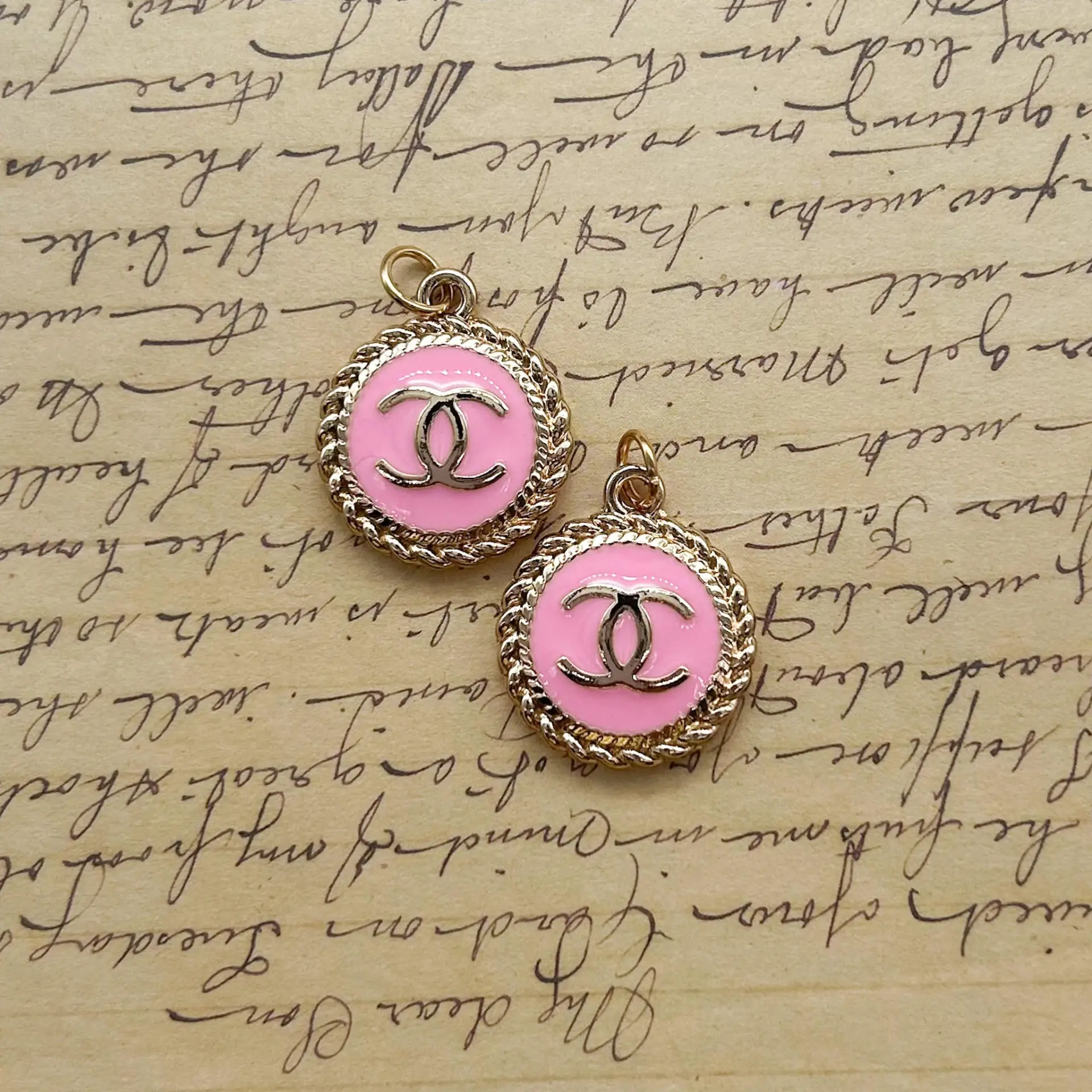 Setof two pink enamel zipper pulls. Goldtone metal. Stamped on back. 20mm – Please see photos for scale.