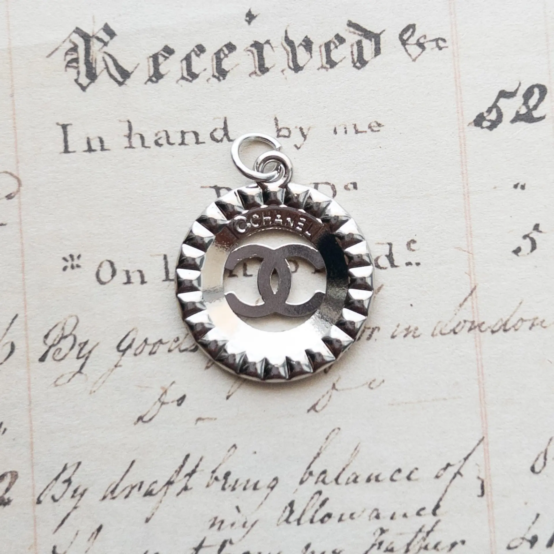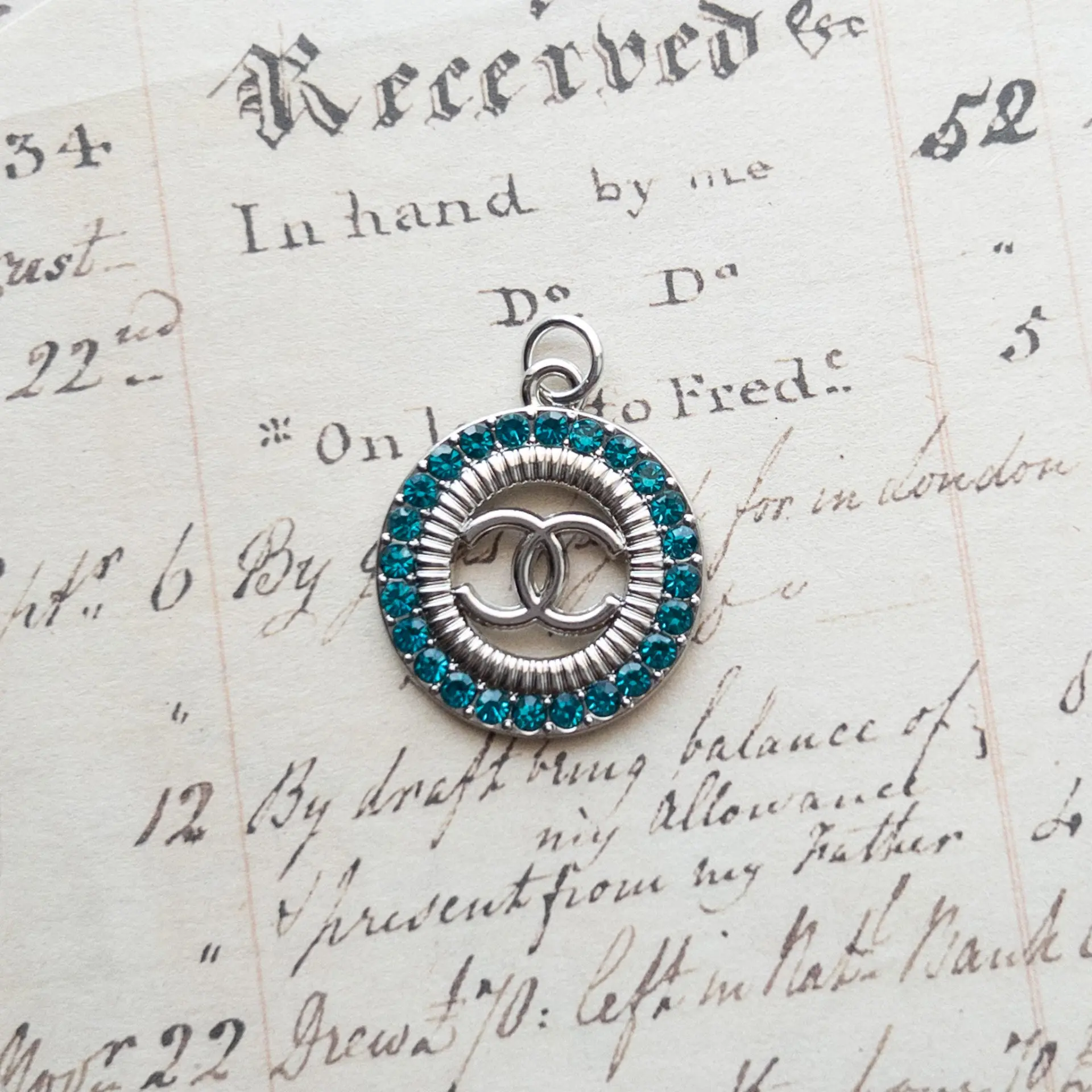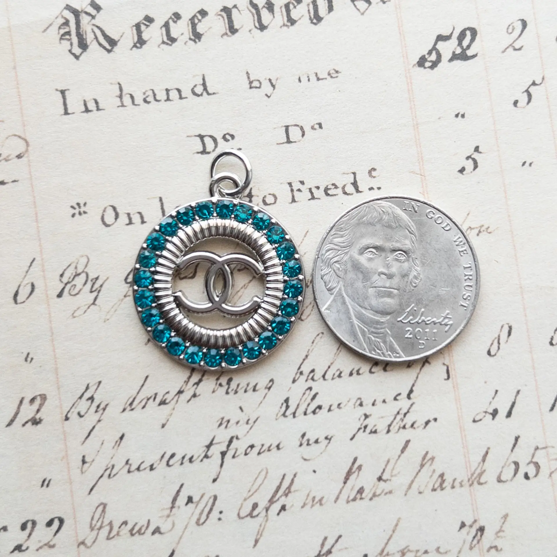 Round zipper pull with teal rhinestones. Silvertone metal. Stamped on back.22mm– Please see photos for scale.