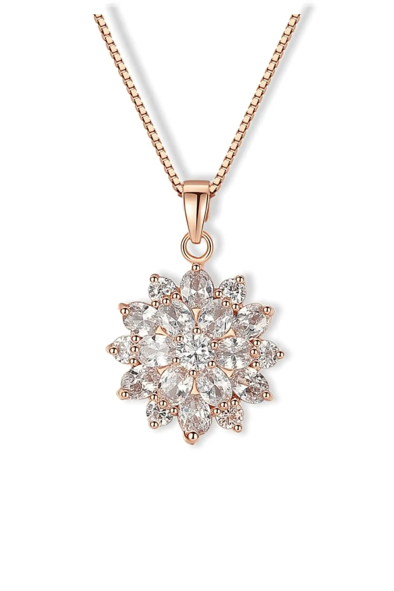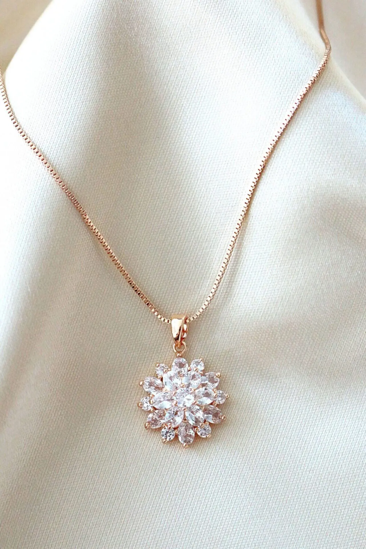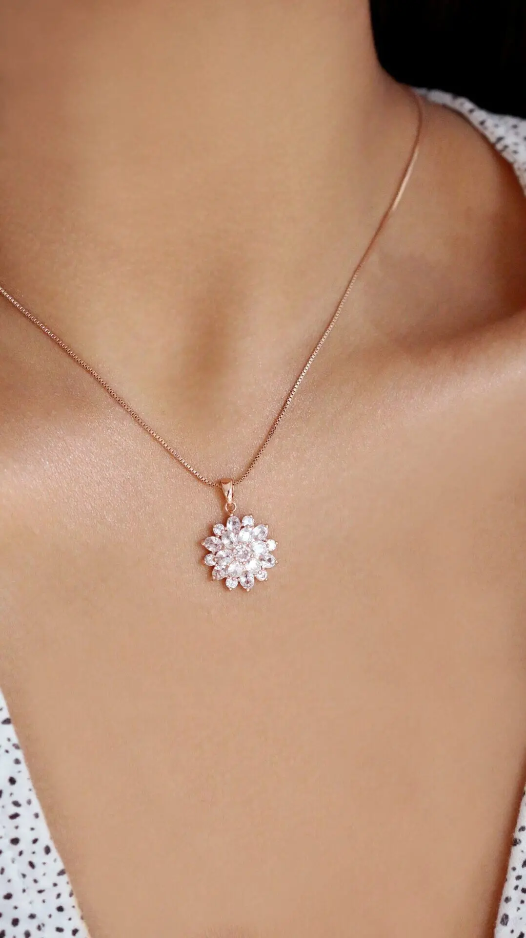 Feminine and elegant rose gold necklace with sparkling sunflower pendant.