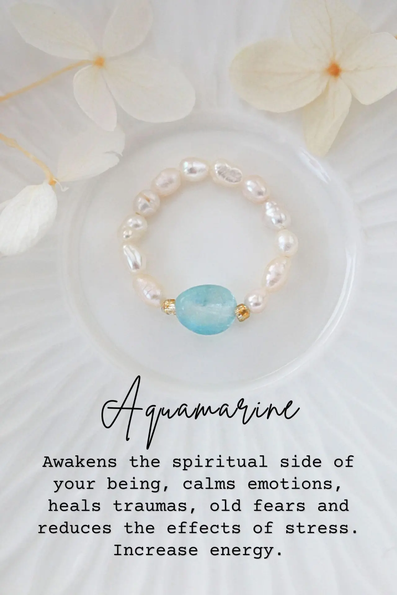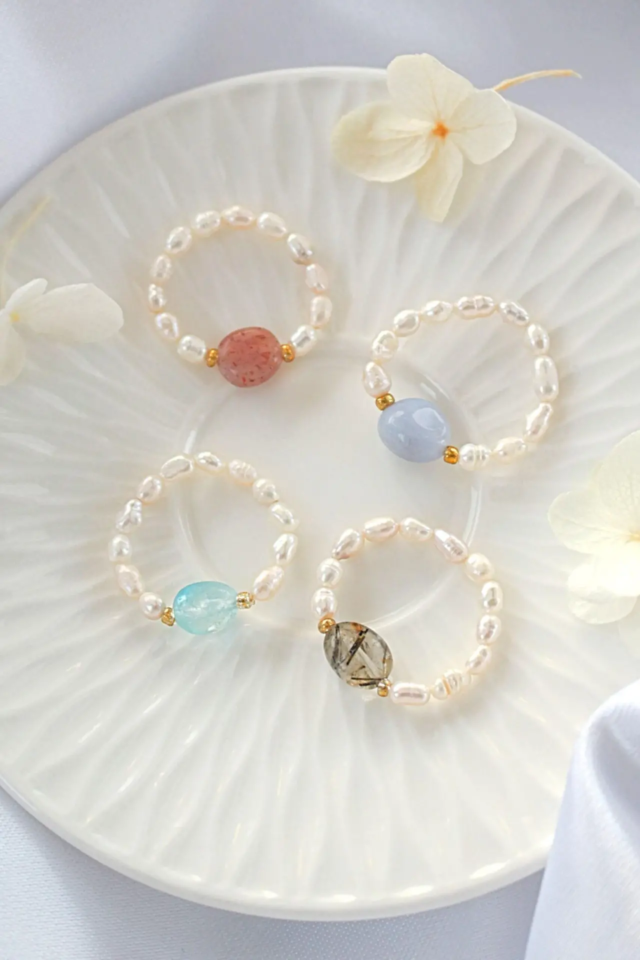 Cute and aesthetic elastic ring made with natural crystals (Sunstone, Aquamarine, Blue Chalcedony and Rutilated Quartz) and real freshwater pearls.
