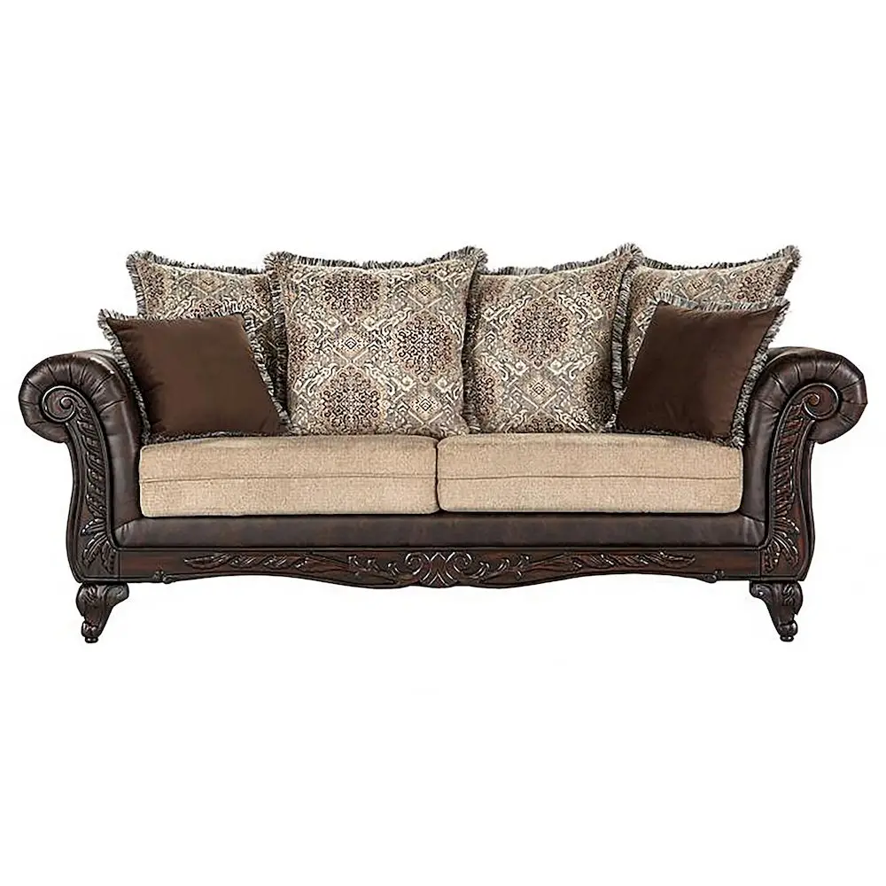 Luxurious three-piece set including a sofa, loveseat, and wingback chair Features a harmonious blend of dark brown faux leather and patterned fabrics Detailed with dramatic rolled arms, carved enhancements, and fringe-trimmed accent pillows Crafted with sinuous springs and supportive cushioning for ultimate comfort Proudly manufactured in the USA, ensuring exceptional quality and durability