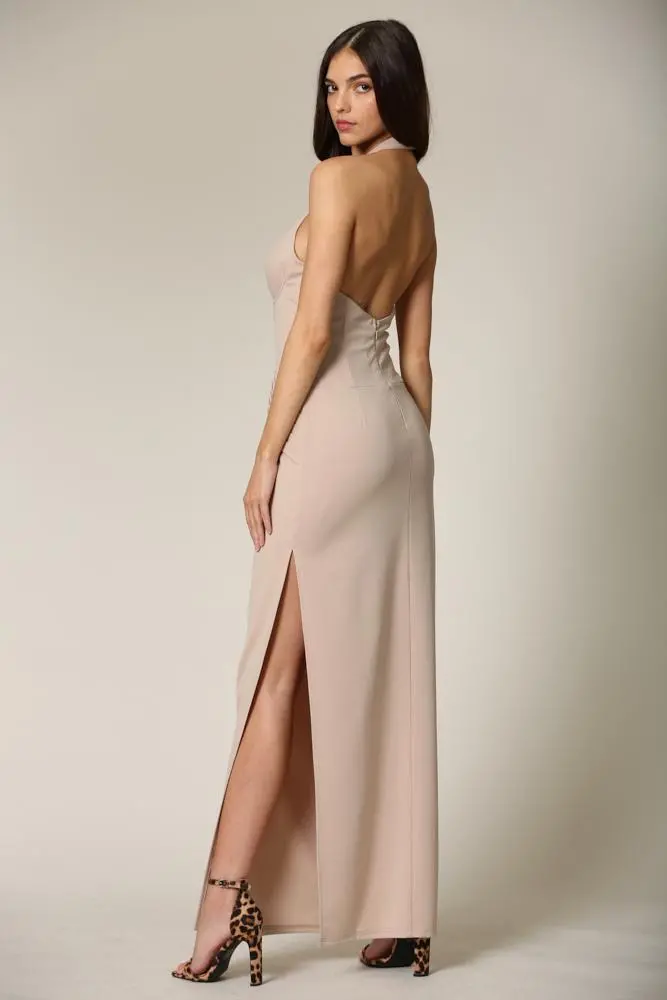 A long dress featuring built-in underwire and front boning and pleated detailing. Side leg slit. Sleeveless. Zipper back closure. Finished hem. Stretch fit.