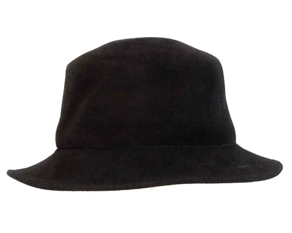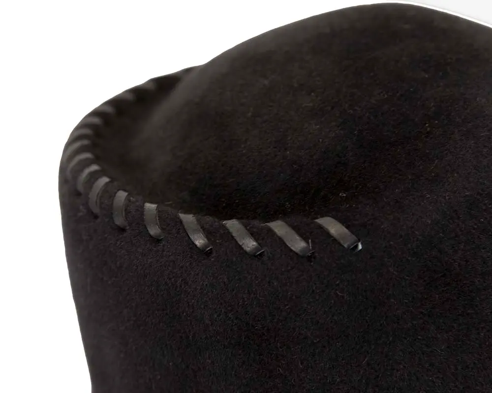 This black hat is made from pure rabbit fur and dressed with leather trim.